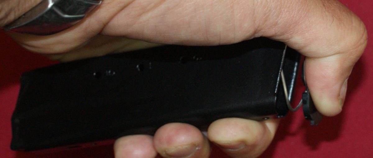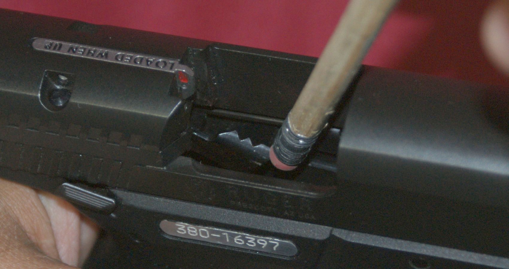 Step 1 - Remove Magazine Press the D shaped magazine latch and remove the magazine. Step 2 - Lock Slide Open & Safety Pull the slide to the rear and lock the slide open by pressing up on the slide stop. Verify that the pistol is completely unloaded. Step 3 - Push Ejector Down While keeping pressure up on the slide stop to prevent the slide from moving forward, press the ejector down until it stops. The next two photos show the ejector in the up and down positions. I typically use my finger when doing this, but if you don't like the idea of sticking your finger in this area while the slide is back, you can also use some other object like a pencil eraser as shown in the photo.
