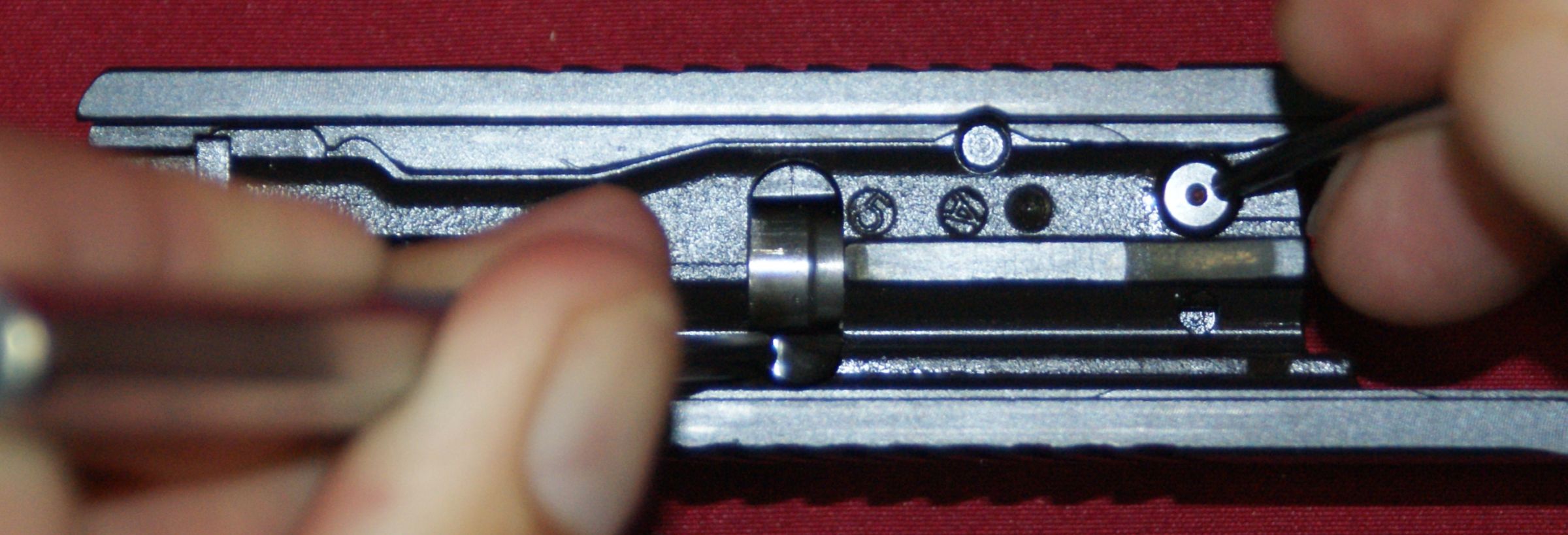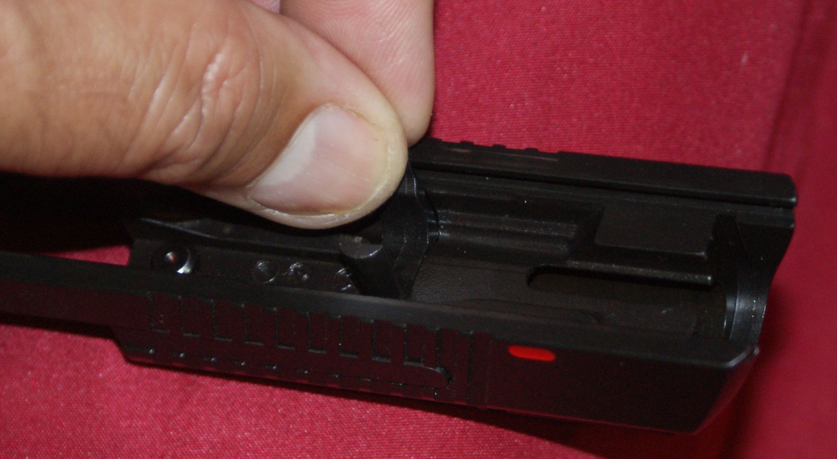 Figure 2 - Ejector in Up Position You will hear a slight click when the ejector is fully down and in the position shown below. If for some reason you skip this step, you will not be able to remove the slide. During reassembly, you can either pull the ejector back into place or insert a magazine to push it back into place.