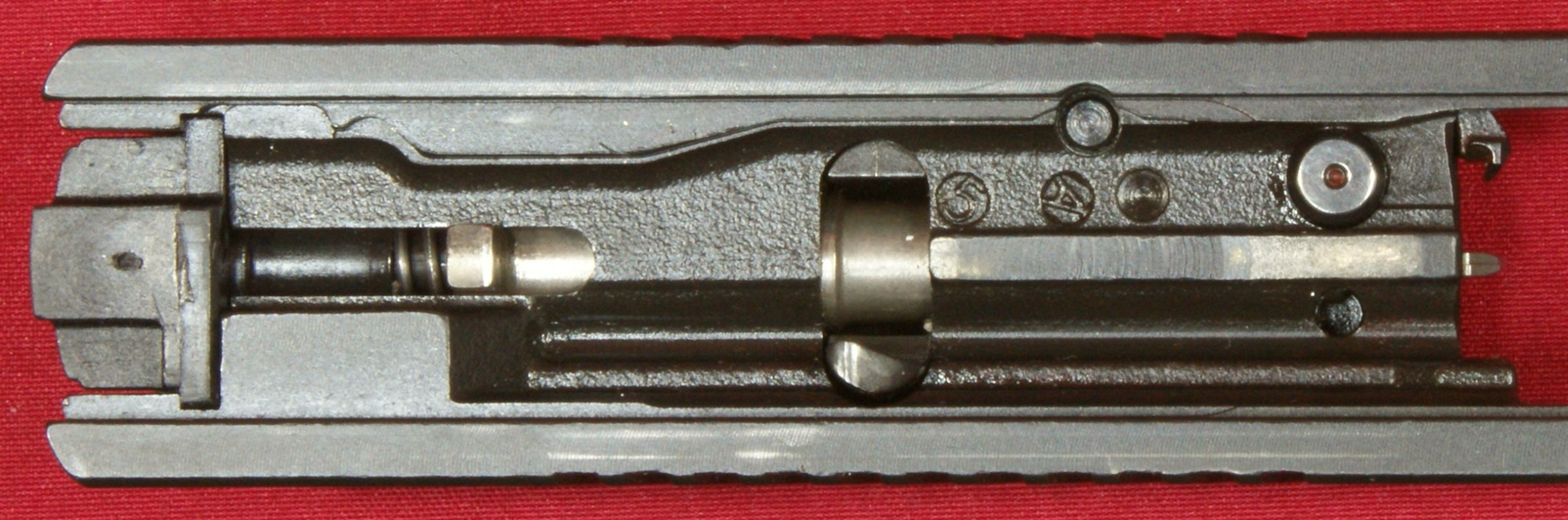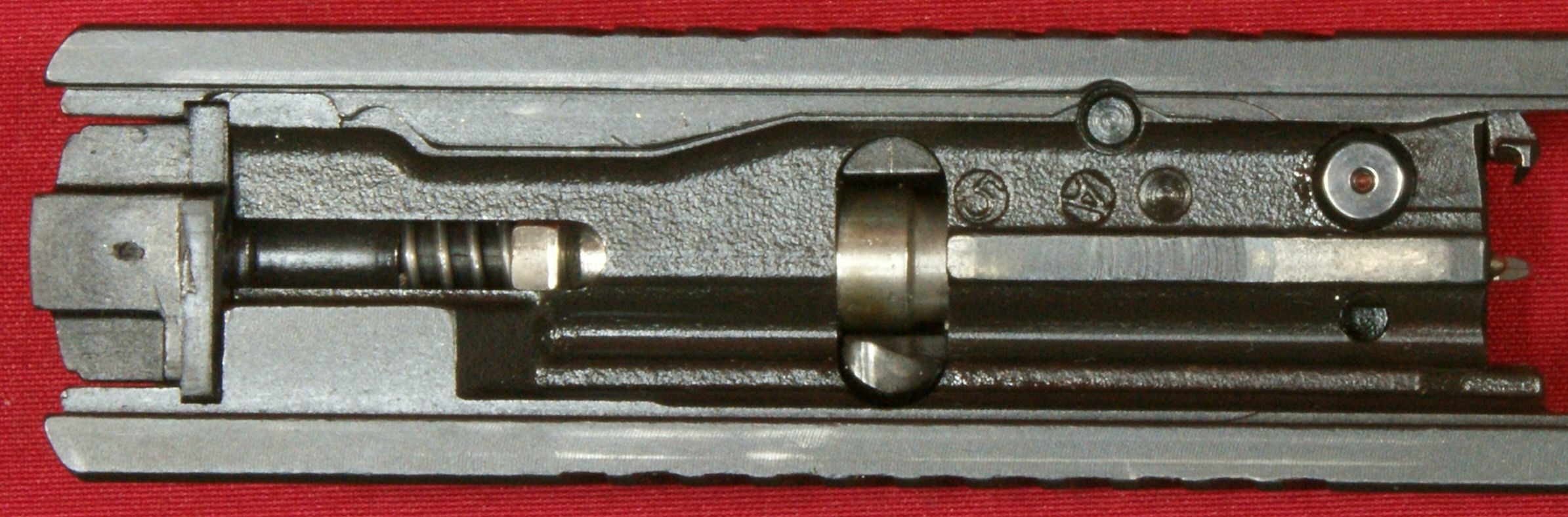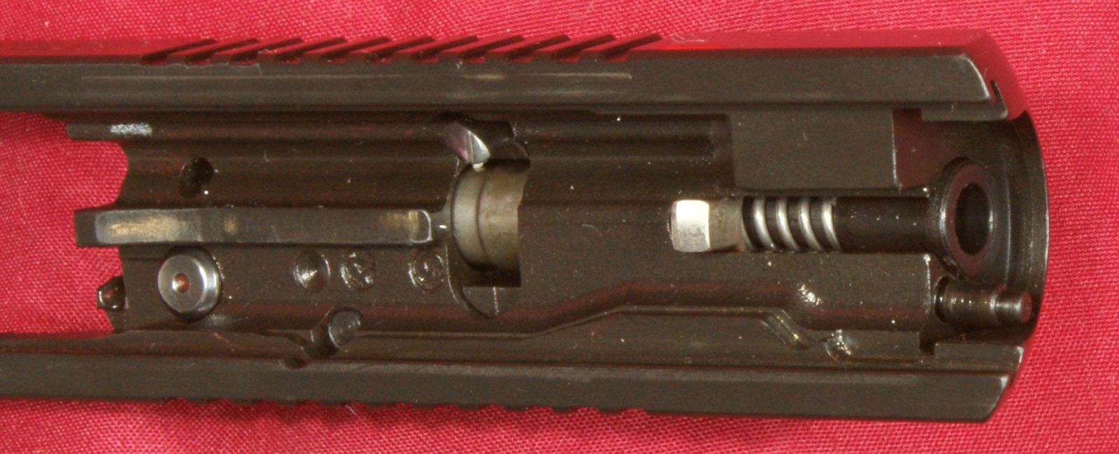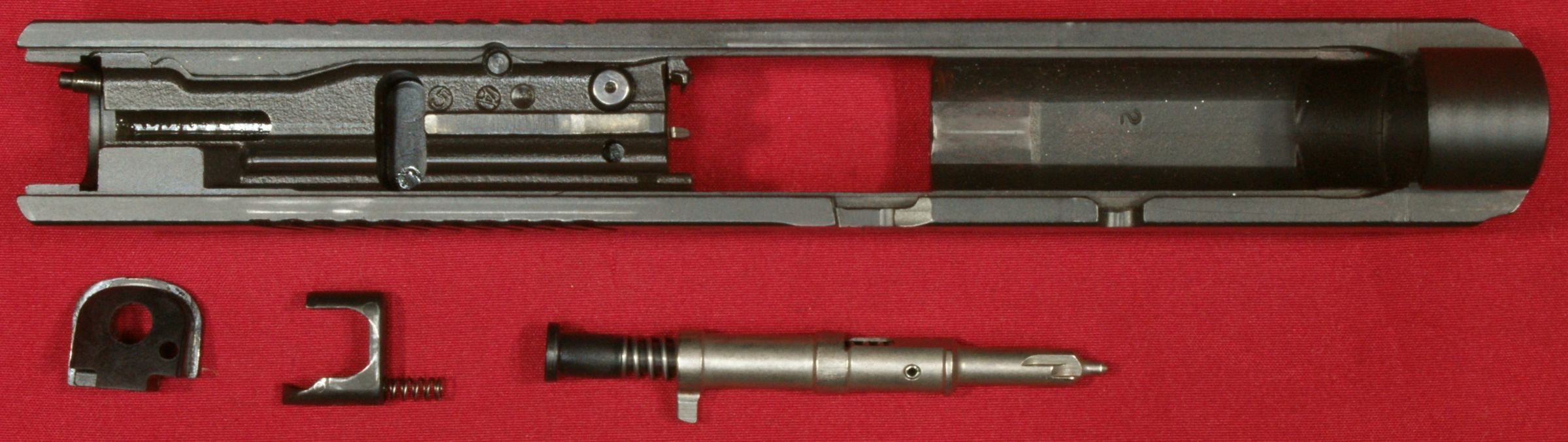 Figure 3 - Ejector in Down Position Step 4 - Remove Takedown Pin While the slide is locked open, on the right side of the pistol you need to press inward on the takedown pin. Pressing inward on the opposite side pushes the takedown pin out on the left side so that you can grab the pin and remove it from the pistol. Step 5 - Remove Slide Assembly While holding the slide to the rear, push down on the slide stop lever and allow the slide to carefully move forward to the position shown below. In this position, the slide is no longer under spring pressure. You can continue with one motion to push the slide off the frame. At the end of this step, you will have broken down the pistol into the slide assembly, frame assembly and takedown pin. Step 6 - Remove Recoil Spring With the slide upside down, lift up on the rear of the recoil spring to disengage it from the barrel lug and then pull the spring rearward out of the front of the slide. Step 7 - Remove Barrel To remove the barrel, pull it slightly up and then forward to pivot the barrel up as shown below. From this position, the barrel can be pulled rearward out of the slide. Normal Disassembly Complete In most cases, this is as far as you would need to go to clean your SR45 pistol. Also, this is as far as Ruger goes in their instruction manual when talking about disassembly of their SR pistols. Slide Disassembly Further reasonable disassembly by the user is possible and Ruger shows this disassembly in their disassembly video. These steps are also outlined below. This next photo helps to get some of the nomenclature correct when describing the following steps. The key components are the (A) Striker, (B) Magazine Disconnect, (C) Striker Blocker and (D) Striker Cover. This photo also shows the striker in its normal partially cocked position. Using your fingers or a couple of punches, press the Striker Blocker (C) and Magazine Disconnect (B) at the same time to allow the Striker Key (A) to move forward to the position shown below. I used punches in the photos so my fingers don't get in the way of you seeing what is being done, but these items can be easily pressed with your finger tips. You should be able to see that the striker has moved forward by looking at the striker through the cutout in the slide for the magazine disconnect. You will also see that the striker cocking lug has moved forward to the position shown below. Next you will need to use a small punch to press the striker cover plunger into the slide so that you can push the striker cover down. This next photo shows the striker cover in a partially down position. Since there is a little spring pressure on the striker and plunger, you will want to keep your thumb over the cover as you slide it out of the grooves in the slide. This next photo shows the striker cover removed. The striker plunger on all my SR pistols stays held in place by the plunger spring. To remove the striker, you can press down on the magazine disconnect and striker blocker so that they don't press on the striker and you can then pull the striker out of the slide. Actually, if you press the magazine disconnect and striker blocker, most likely the striker will drop out if you hold the slide with the barrel end pointing up. In this last step, you can lift the magazine disconnect out of the slide for cleaning. The photo below shows the slide disassembled to this level which should provide you the ability to thoroughly clean the striker and slide. Magazine Disassembly Magazine disassembly is also like most pistol magazines. Use a punch (or something) to press the magazine spring seat into the magazine and then slide the base plate forward slightly. Once the spring seat protrusion is below the base plate, start sliding the base plate off the magazine base while keeping your thumb against the spring seat to prevent it and the spring from flying across the room. After you relieve all pressure off the spring, you can remove all the components as shown below.