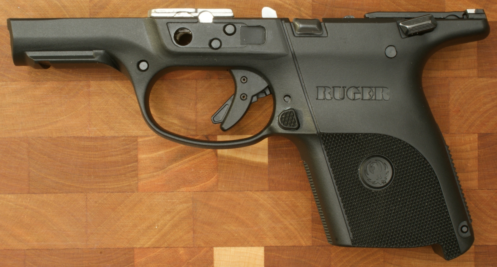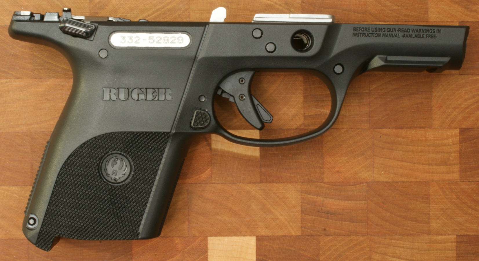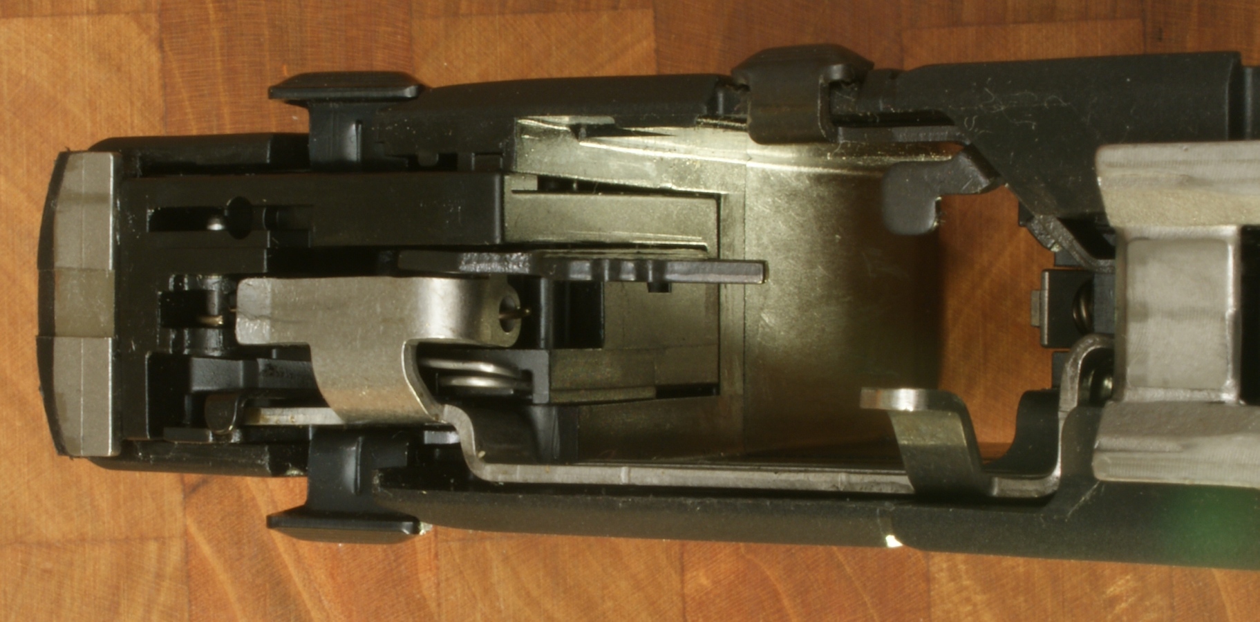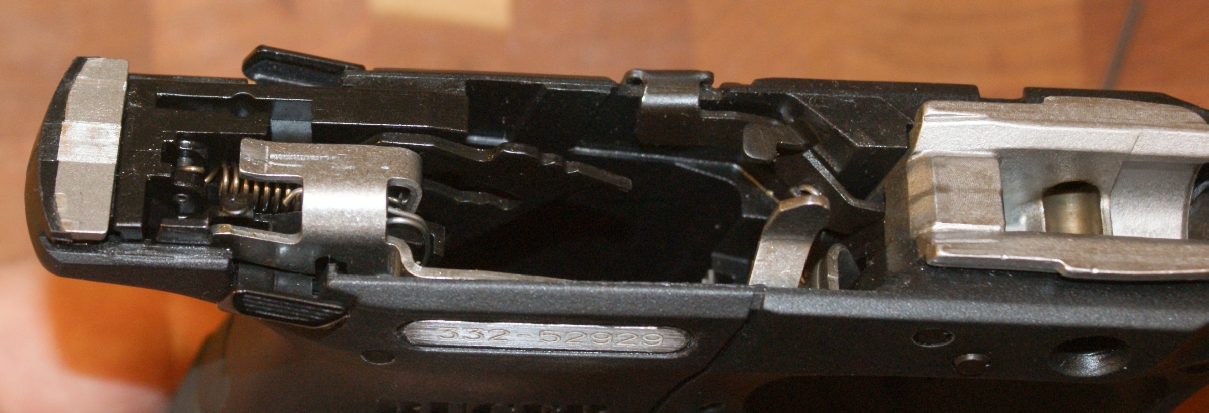 Additional Disassembly If at some point you would like to thoroughly clean your striker assembly and striker cavity in your slide, you can remove the striker assembly by following these steps. There are three key components you should be aware of when doing this; A - Striker Blocker, B - Magazine Disconnect, and C - Striker Key. First you press the Striker Blocker (A) and Magazine Disconnect (B) at the same time to allow the Striker Key (C) to move forward to the position shown below. Now you can remove the Striker Cover (black nylon piece at the end of the slide). Using a small punch, press down on the Striker Cover Plunger and push the Striker Cover out of the slots at the rear of the slide. Next, press down on the Magazine Disconnect (B) and you can remove the Striker Assembly from the slide. As a note, the right lip of the magazine presses the Magazine Disconnect up when the slide is forward. If a magazine is not installed, the disconnect is down which blocks the travel of the striker and will not let the striker impact the cartridge, even though the pistol seems to fire when you pull the trigger. You can then remove the Magazine Disconnect by pulling it out of the slot in the slide. These pieces are shown below. This last photo shows a view looking down the striker cavity in the slide. Reassembly is basically the reverse of these steps. Barrel The barrel on the Ruger SR9c measures 3.50". Since barrel length is measured from the end of the barrel to the breech face, the barrel length is the total length of the part below. The barrel is an investment casting which is made from SAE 410 (or UNS4100) stainless steel in Ruger's Pine Tree Casting facility. I have read several other reviews that talk about castings in a negative light. A casting does not always equal inferior quality or durability. The F-22 aircraft, the most advanced aircraft in the world, "incorporated 61 castings on the F-22; many of them utilized in critical structural applications." You can read this technical paper on the F-22 here. Another thing to remember is that Ruger has it's own casting facility and has been in the castings business since 1963. Ruger is not some low budget import company that was low bid on a casting contract. My last point is that Ruger is responsible and liable for their products. I know everyone wants to make a profit, but I don't think Ruger would take on the risk of putting an inferior critical component in their pistol. The photos below show the barrel from all sides. The barrel is a casting and the critical areas get final machined into the configuration shown below. This machining is clearly seen by looking at the exterior barrel surface (shiny). Also, each barrel gets proof tested and you can see the proof mark "R" stamped into the barrel in the photo below. I have read several other reviews that comment negatively on the matte finish of the exposed barrel chamber area. My impression is that the surface finish is better matte than polished because the matte finish more closely matches the upper surface of the slide. I also would not consider this to be a true negative aspect of the pistol, but instead just a matter of personal preference. Slide Assembly Just like the barrel, the slide is an investment casting (see above for the reasons not to worry) and is made from 415 stainless steel which is a special proprietary blend that is somewhere between 410 and 420 stainless steel. The exterior had a very nice look and finish. In certain areas on the interior, you could tell there was a certain roughness associated with a casting, but nothing I would consider to be negative on the quality of this pistol. Also, I could tell that critical areas were final machined to maintain critical interface features (i.e. slide slots, barrel contact areas, breech face, and I'm sure more). You can see for yourself by looking at the photos below. Also note that I didn't clean the lubricant off the interior surface of the pistol before taking the photos. This may cause it to look rougher that it actually was in some areas. Frame Assembly The pistol frame is manufactured from glass-filled nylon. Glass-filled is a good thing because this increases structural and impact strength along with rigidity of the frame. There are lots of photos below to show the details of this assembly. If I were you, I would take Ruger's recommendation and not do any more disassembly. After you study the interior mechanism, they are actually very simple, but again I don't recommend any further disassembly. I'm not going to talk about every detailed feature of this assembly, but I will cover some items I think are significant. In the photo below, you can see that Ruger has a metallic Camblock (1). This is a high stress and high wear area so the metallic part will be more durable than just the nylon frame. This block is also pinned in place by three different pins spread apart which gives it an even stronger attachment footprint to the frame. In the photo below you can see the Slide Stop (2). By inserting a magazine, you will see how the slide stop moves up when the magazine follower comes in contact with the stop. The Ejector (3) is shown in the down position and you can also see the Trigger Bar (4). If you look closely, you can see how the manual safety blocks the Trigger Bar from moving back when the safety is engaged. If you hold the trigger in the forward position and pull back on the Inner Trigger (5) (trigger safety), by looking at this frame from the view below, you can see how the Inner Trigger blocks the Outer Trigger (normal trigger) from being pulled by contacting the frame unless the Inner Trigger is pulled. You can also press the Magazine Latch Button and watch how the Magazine Latch (6) moves to the latch and unlatched positions.