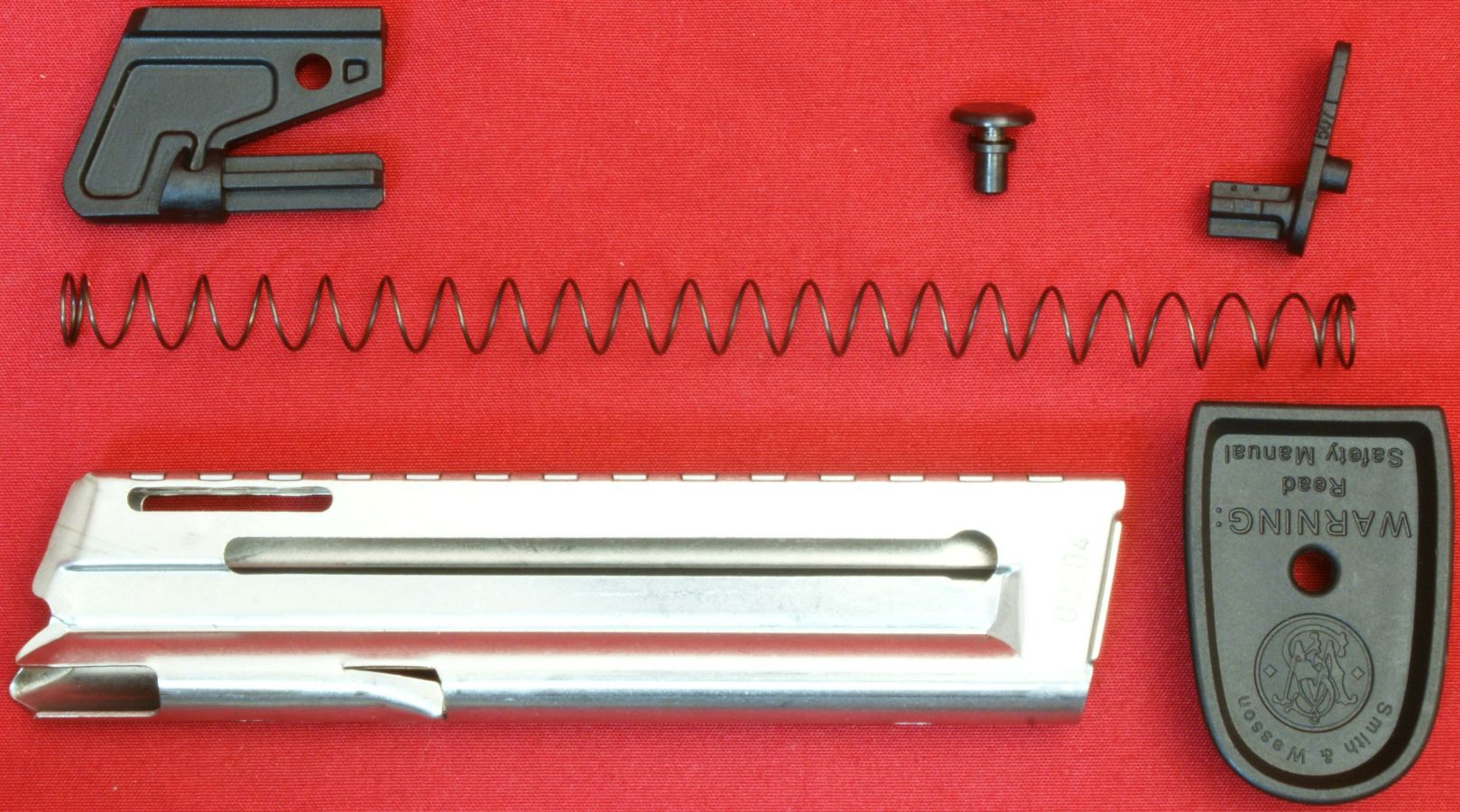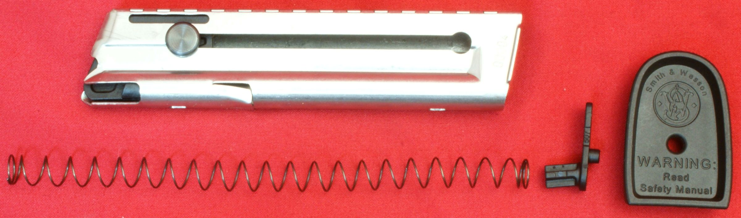 Step A - Remove Barrel Nut Using the wrench provide with the pistol, turn the barrel nut counter clockwise to remove the nut. Although the nut was snug on this pistol, I don't think it had a significant amount of torque. Based on the Walther P22 Instruction Manual, the barrel nut should only be finger tight. To install a thread adapter for a silencer, all you would have to do is thread it back on the end of the barrel, but this would have to be done with the slide installed. Step B - Remove Barrel Sleeve The barrel sleeve can easily be pulled of the barrel. Step C - Remove Barrel To remove the barrel you will need to push the barrel directly rearward. Although there is a very close fit between the barrel and frame, the barrel will slide out as long as you are not pushing it to the side and causing it to bind against the frame. Once the block on the barrel passes the frame support area, it slides out relatively easy. Final Disassembly For Barrel Removal The photo below shows the parts after barrel removal. One thing to note is that the barrel sleeve must be installed with the notch properly aligned to the frame. Magazine Disassembly Magazine disassembly is extremely easy like most magazines of this type with a floor plate retainer. Step 1 - Safety Remove all cartridges from the magazine. Step 2 - Remove Floor Plate, Retainer & Spring To remove the floor plate you will need to press down through the hole in the center on the floor plate retainer as shown below. With the floor plate retainer pressed down, you can slide the floor plate slightly forward. I say slightly only because you will need to make sure your thumb is positioned to prevent the spring from shooting the retainer across the room when you slide the floor plate off the bottom of the magazine. Once you let off pressure with your thumb, you can slide the floor plate off the spring and spring out of the magazine body. Step 3 - Remove Follower To remove the follower you will slide the follower down to the hole at the bottom of the magazine. Once there, you can lift out the pull-down button which will allow the follower to fall out of the magazine. This figure below shows all the parts for the Smith & Wesson M&P22 Magazine. Reversible Magazine Release To remove (reverse) your magazine release button you will first need to field strip your M&P22 pistol. In these next set of photos I'm showing the position of the magazine release spring (looks like a pin or rod) and magazine release button as you reposition these to remove the button. In position A you have the magazine spring in the button recess and the button is in a normal right handed configuration. In position B the spring has been pushed out of the recess with a screwdriver. In Position C, the magazine release button has been pressed up against the spring. In Position D the spring has been pushed up so that you can push the button under the spring. Once you get the button and spring to this point, you can push the button out of the frame. A