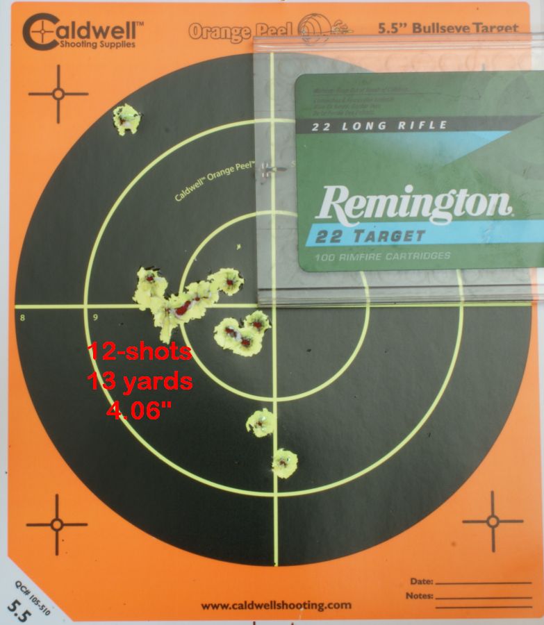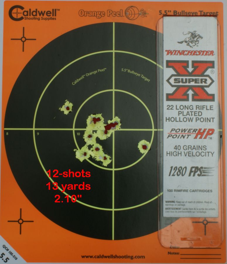 Yards from a Bench Next I decided to finish up a couple of boxes ammunition so I shot some Federal Classic High Velocity 40 Grain Copper Plated (Load No. 810) and Winchester Super-X 40 Grain High Velocity Plated Hollow Point (Load No. X22LRPP1). Again the M&P22 functioned without issue and handled the 40 grain high velocity rounds. These next two photos show a 12-shot group of each shot from a bench at 13 yards. I then decided to give it a try on some value high velocity 36 grain bulk ammunition like Remington 22 Golden Bullets 36gr Plated Hollow Points and Winchester Xpert 22 36gr Hollow Points that I keep around for plinking. The Remington ammunition shot without issue, but the Winchester Xpert ammunition would not properly eject the case. I cleaned the pistol and tried the Winchester again and still had the same issue. Then I swapped back to the Remington and the M&P22 functioned again without issue. Averaging these four 12-shot groups gives an average group of 2.08". The ammunition I selected for more in depth accuracy testing is below.