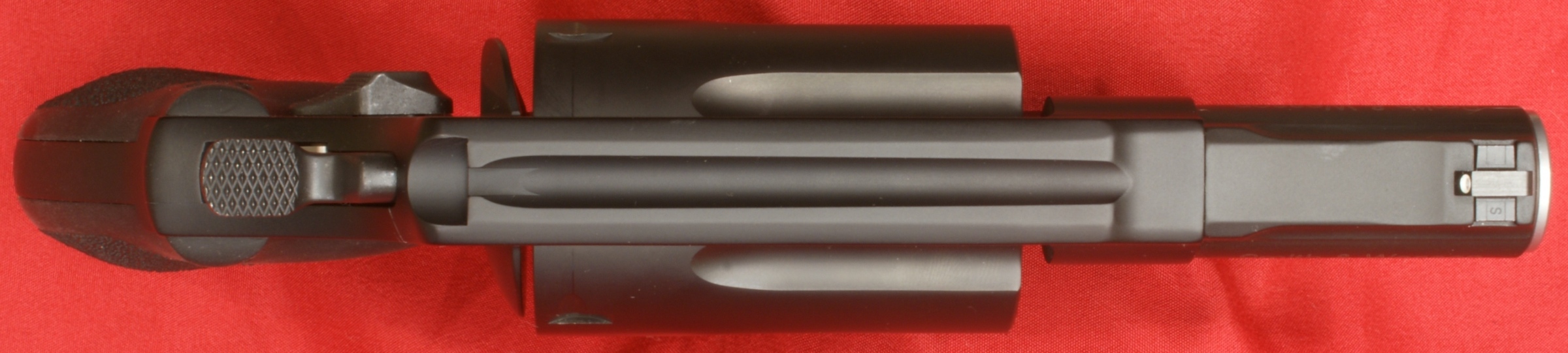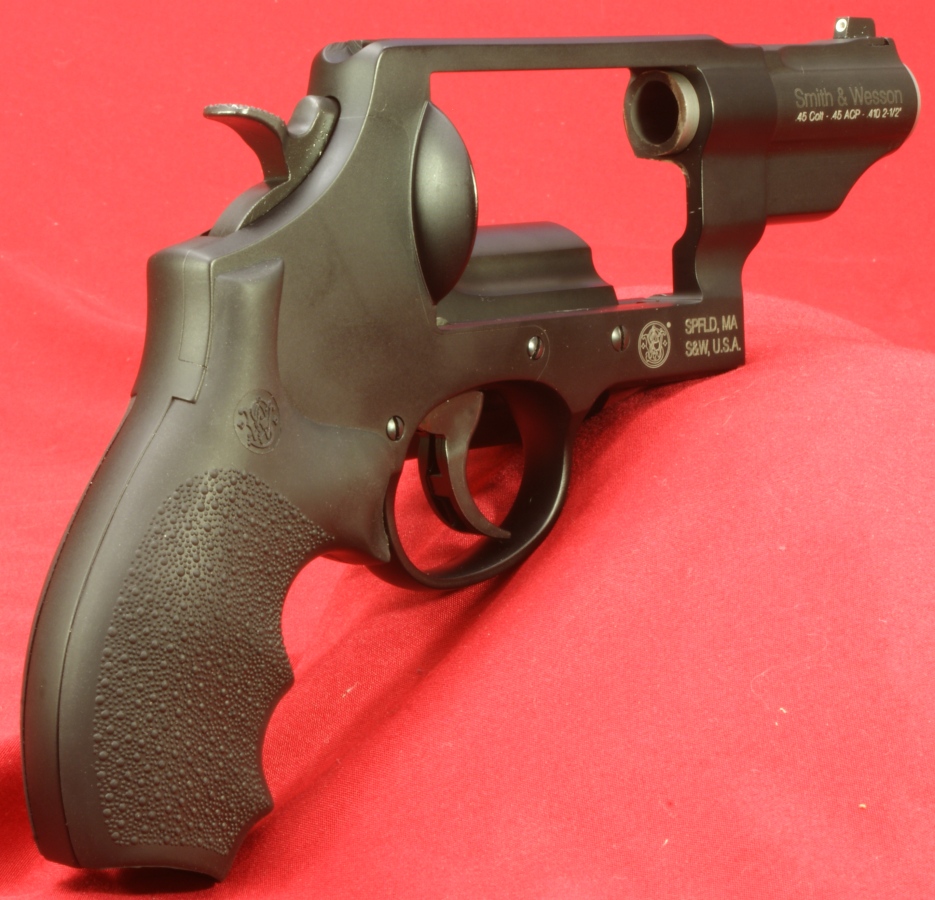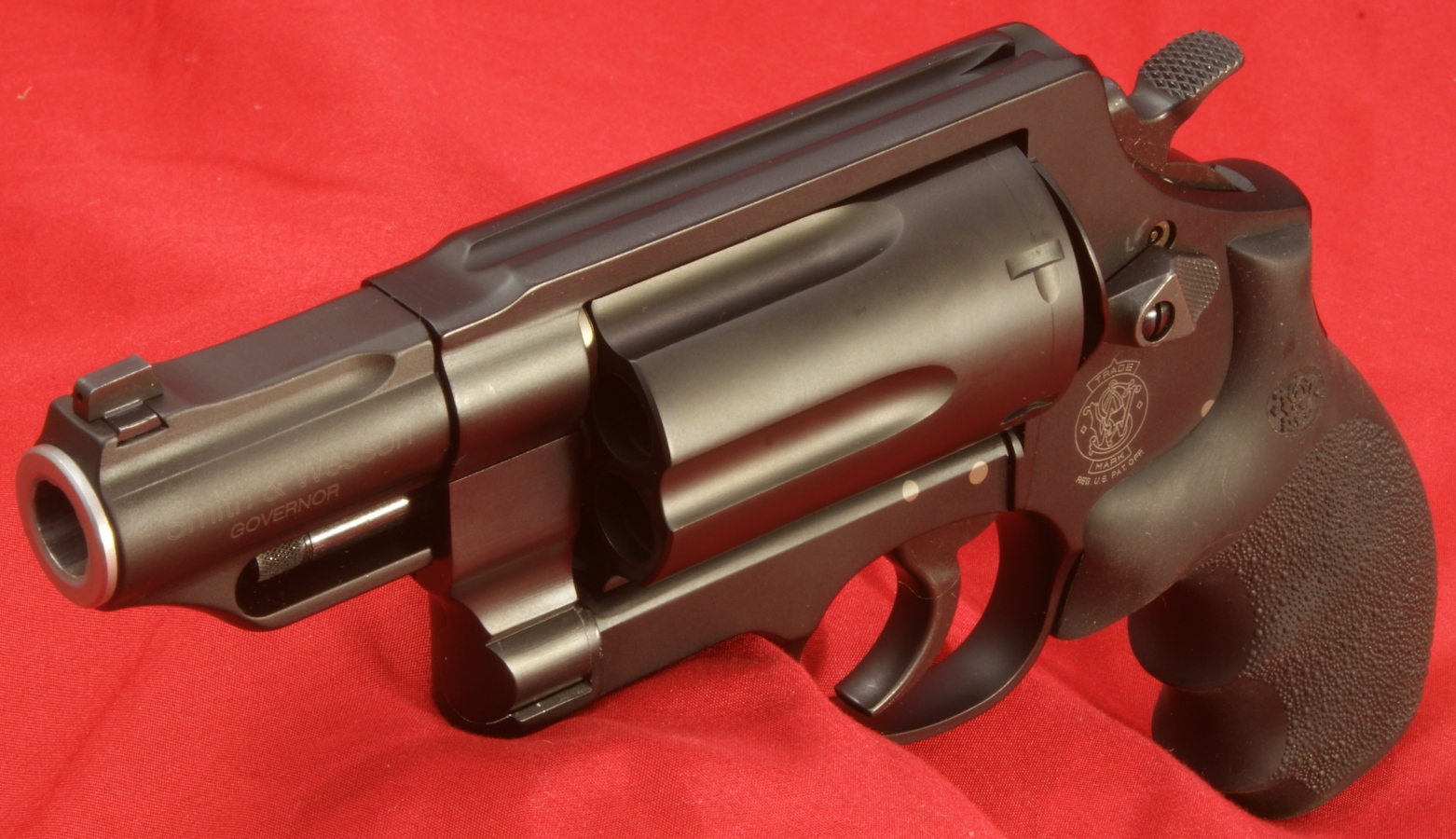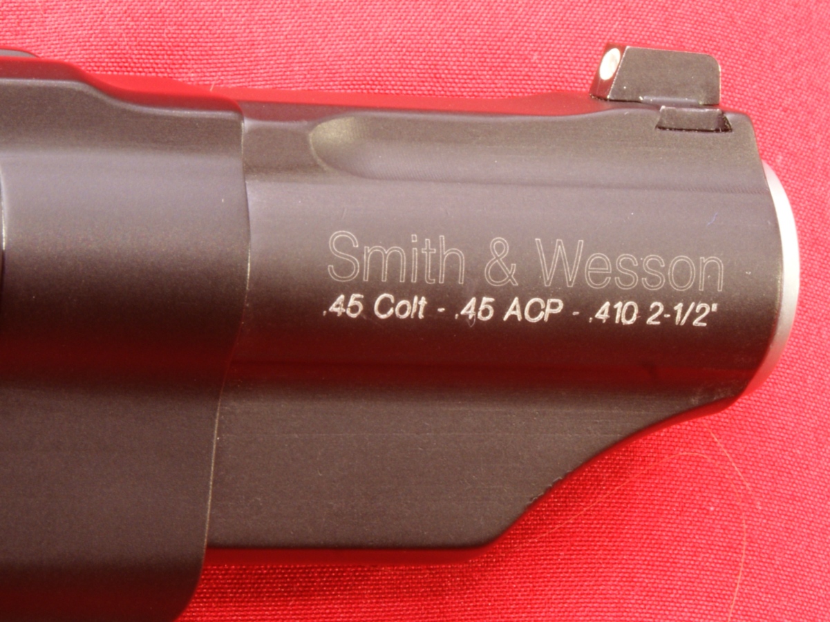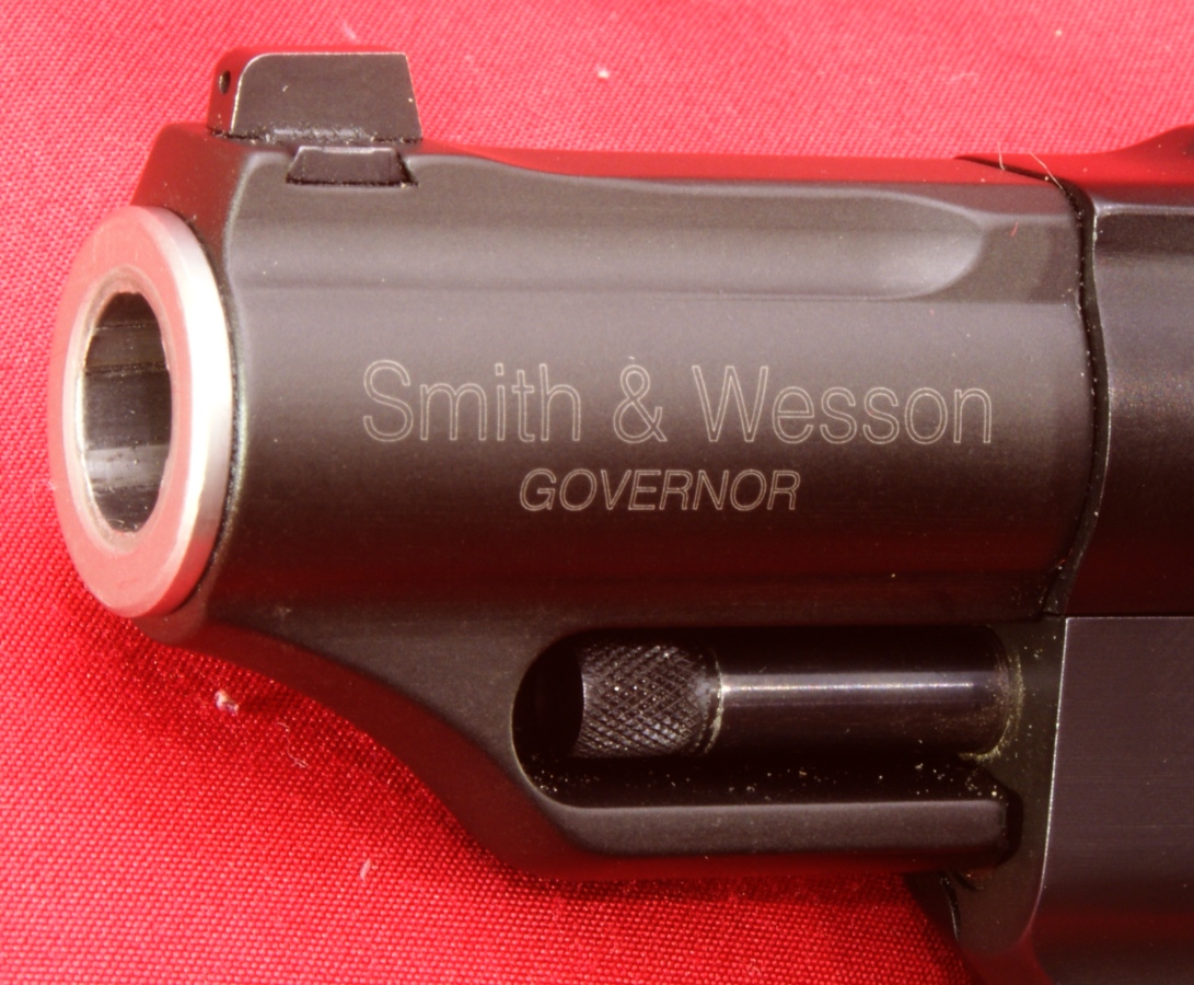 Smith & Wesson Governor Review In this part of the Smith & Wesson Governor revolver review, I will try to cover in detail the features of the Governor Revolver. Since my feeling is that a picture is worth 1000 words, I may not comment on every photo, but have included them for your own study. As with nearly all my photos, you can click on the photo to bring up a higher resolution photo showing the details even better. The first thing I want to cover on the Smith & Wesson Governor Revolver is the "Patented, heat-treated scandium alloy frame for superior strength and reduced weight". I think it would be more accurate if S&W used the term Aluminum-Scandium Alloy because there is only a small percentage of scandium present in the alloy (0.05% to 0.15%). The addition of scandium in this alloy does give the material improved properties over aluminum alone. It also allows S&W the ability to market their firearms using a cool name like Scandium for the material. You can read more about scandium at this Wikipedia link. If you want to review the details of the actual S&W patents, they can be found at these links; Patent No. US 6,557,289 or Patent No. US 6,711,819. The cylinder is a stainless steel alloy that is PVD coated. PVD (Physical Vapor Deposition) is an environmentally friendly vacuum coating process that provides brilliant and durable finishes. In this case the cylinder coating is matte black to match that of the frame. I was pleased with the finish on both the frame and cylinder. This Governor Revolver measured 8.68" in length, 5.44" in height, and 1.71" in width. These are slightly different than the rounded off values in the specifications which were 8.5", 5.5" and 1.75". I don't feel these differences are significant other than they are slightly different than what I measured. The front sight is dovetailed in place and the rear sight is part of the frame. The hammer includes a checkered pattern for thumb cocking. In the photos below, you get a good idea on the sight picture for the Governor along with an end profile of the Hogue Grip. These next two photos give you a couple of isometric views of the revolver. The Hogue grip has a very nice feel and fits my hand well. I liked the rubber feel, texturing on the sides and finger grooves on the front of the grip. The barrel shroud was marked "Smith & Wesson" on both sides and with the right side showing the caliber designations ".45 Colt - .45 ACP - .410 2-1/2"" and the left side with the model name "GOVERNOR". The caliber markings is actually some type of raised letter marking. You can also see the end of the stainless steel alloy barrel which measured 2.74" in length. The tritium front sight has a white high visibility area and is mounted via a dovetail in the end of the barrel shroud.