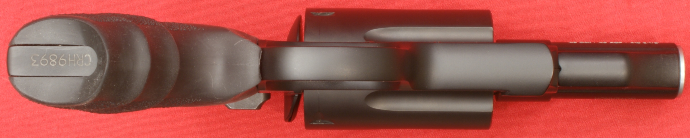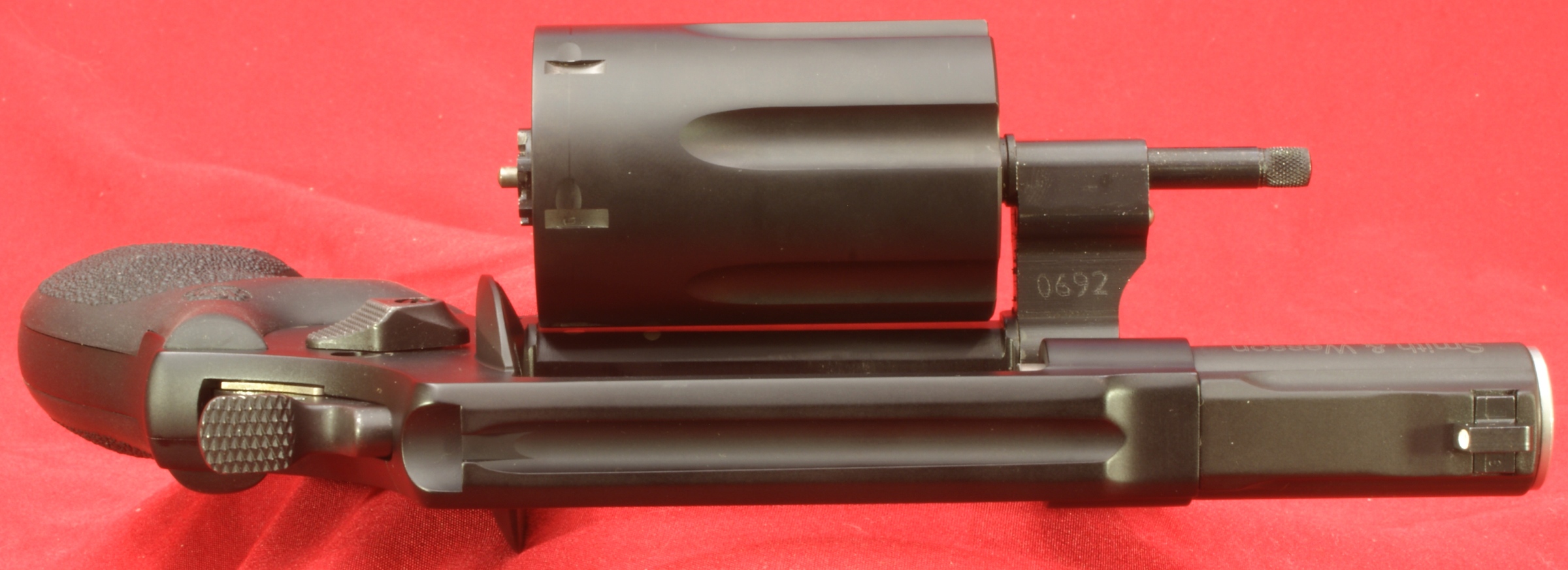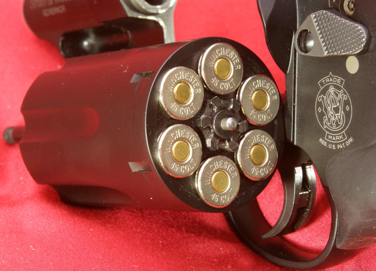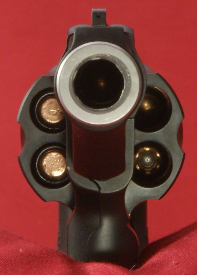 Figure 10 - Left Side The right side of the frame was marked with the Smith & Wesson logo along with "SPFLD, MA S&W U.S.A.". The base of the frame on the grip was marked with the serial number of the revolver. On the left side of the frame is the Smith & Wesson Trade Mark. Also on the left side are the thumb piece and internal lock. In this photo I have already pressed the thumb piece, slightly opened the cylinder and inserted the key. The two photos below show the revolver in the unlocked (left) and locked (right) state. In the locked state, a small indicator rotates up below the hammer and has the word "Locked" stamped into the indicator. The average trigger pull force for 10 pulls in the single action mode measured 4 pounds 15 ounces. The trigger pull force in the double action mode was greater than my Lyman Trigger Pull Gauge which has a maximum of 12 pounds. The double action trigger pull was firm but smooth while the single action trigger pull had a very crisp feel. With the cylinder open, you can see that the serial number and model name are engraved on the front support of the frame where the yoke nests when closed. As with most revolvers, you can see marks are already developing on the frame finish where the spring loaded center pin must slide when opening and closing the cylinder. The yoke also has a number engraved on the inside. The Governor Revolver weighed in empty at 29.65 ounces which matched the S&W specifications of 29.6 ounces. Next I wanted to load it up, try out the moon clips and inspect the revolver loaded. For range testing (next part of the review) I picked up some of the Winchester PDX1 .45 Colt and .410 Defender shells. I also had some PMC .45 Auto on hand. In this photo I show the Governor loaded with six cartridges of .45 Auto using the 6-round moon clip. In this photo I show the Governor loaded with six cartridges of .45 Colt. In this photo I show the Governor loaded with six shells of the .410 PDX1 Defender shells. In this photo I show the Governor loaded with two cartridges of .45 Auto using one 2-round moon clip, two cartridges of .45 Colt and two shells of the .410 PDX1 Defender. This is real versatility. There is nothing like staring down the barrel of a loaded gun to wake you up. The Governor is loaded with the mix above and a .45 Auto cartridge is lined up with the barrel. The only manufacturing issue I have found on this Governor Revolver during this review is the chamfer on the inside of the barrel. In the photo below you can see that the chamfer appears to be slightly off center of the barrel.