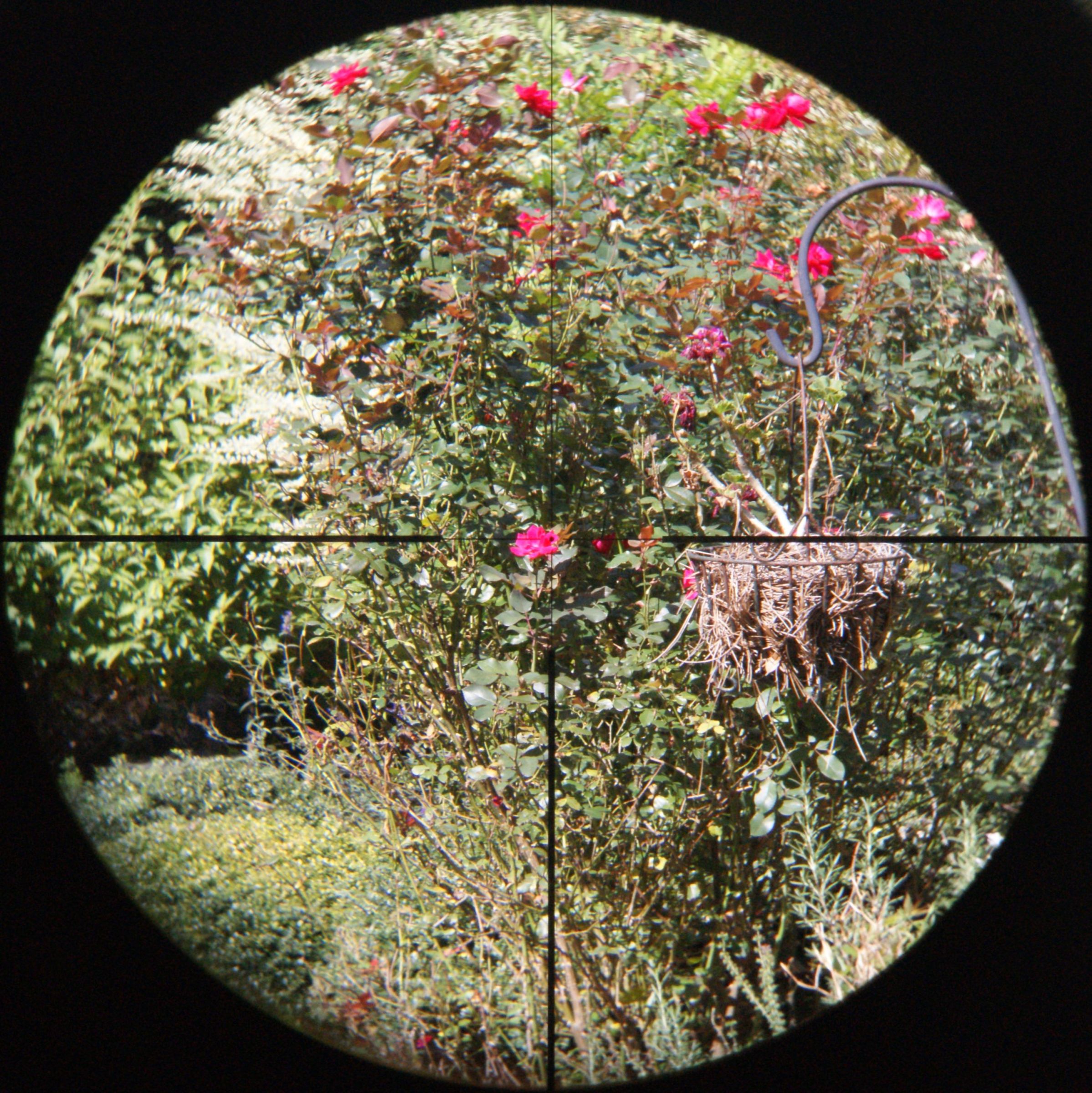 Figure 45 - 10 yards, 15x These next two photos show looking through the scope at a mailbox located 80 yards from the scope with the parallax adjustment ring set at 100 yards. Unless I'm at the bench or in a hunting stand looking at an area with an average distance different that 100 yards, I keep my parallax adjustment set at 100 yards. This is the standard parallax free distance for centerfire rifles without an adjustment ring and I feel this distance offers a good compromise for multiple hunting situations. When at the bench, I always dial in my actual range. I struggled getting the camera lined up for the 15x shot and ended up with a slightly hazy look. As you increase the power of any scope, the exit pupil diameter becomes smaller and proper eye alignment (or camera in this case) is more critical for maximum clarity. The exit pupil diameters (objective lens diameter divided by zoom power) ranges from 11mm at 2.5x to 3.3mm at 15x. Figure 46 - 80 yards, 2.5x