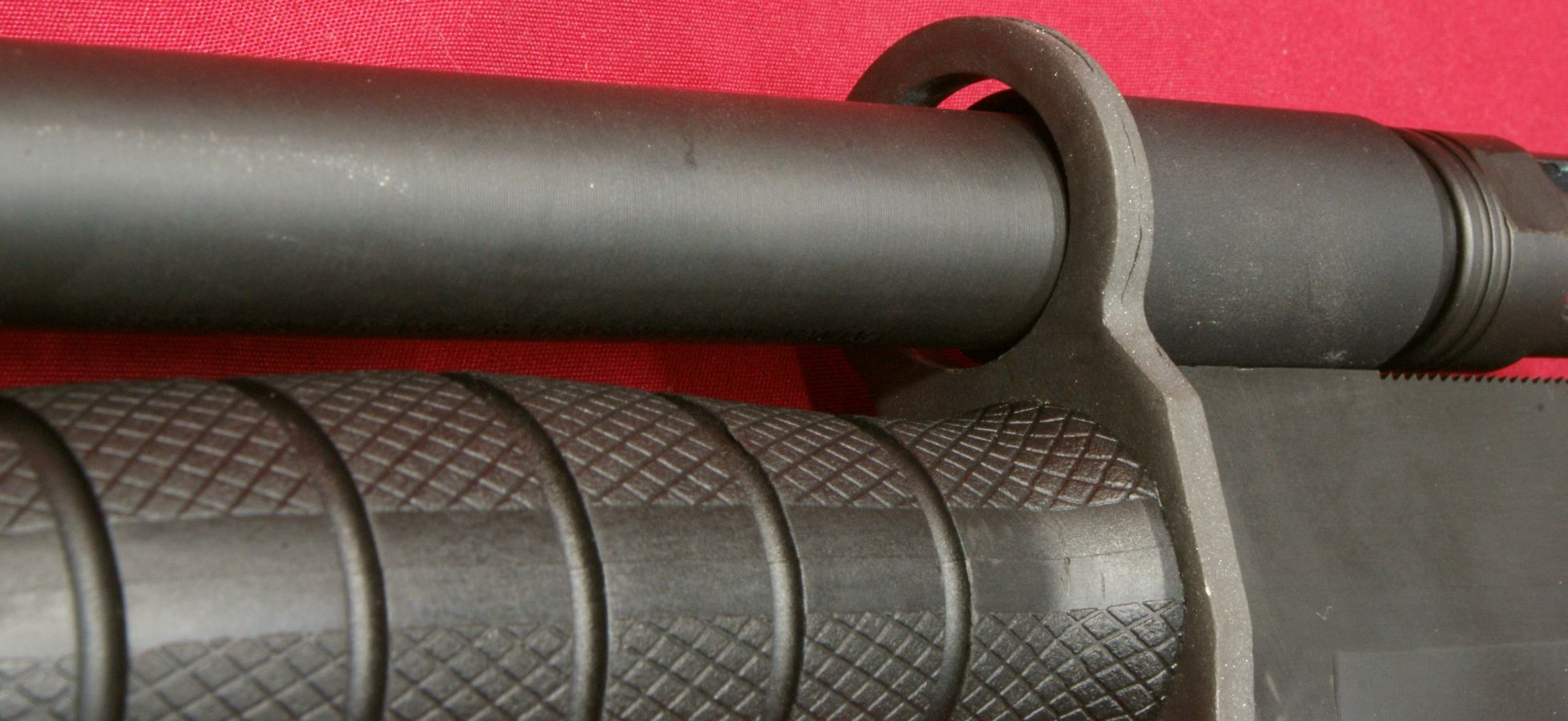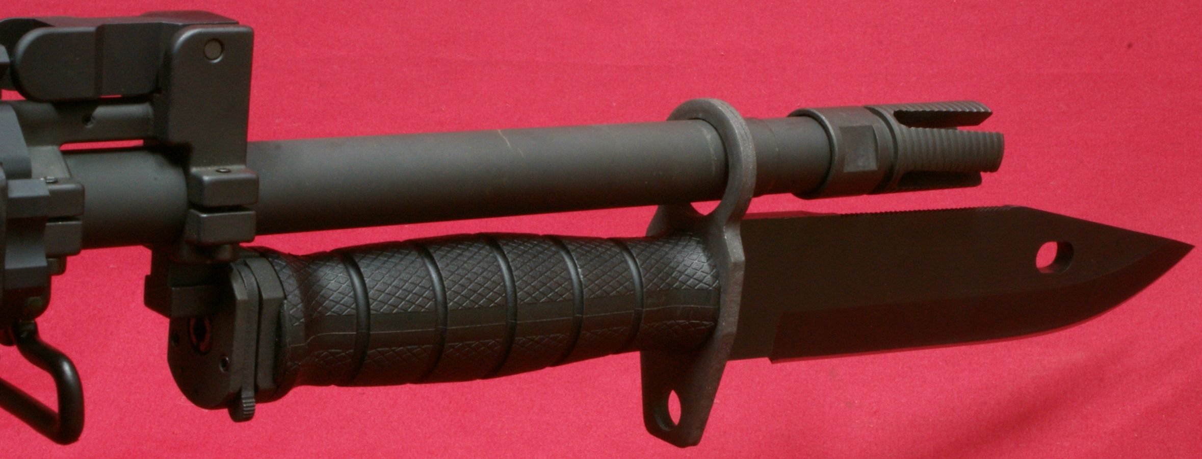 TACTICOOL22 It took me many years of owning AR style rifles before I decided to purchase a bayonet. Finally, a year or so ago, I made the investment and purchased an Ontario M9 Bayonet because one of my review rifles (Ruger AR-556) included bayonet lugs integral with the front sight and I wanted to check out this feature with a bayonet. Once I installed the bayonet on this rifle and prior to getting an adapter, it didn't take long for me to understand there was an issue. The 16" barrel on the Ruger rifle was longer than the 14.5" barrel length that was really intended for use with a carbine length gas system. This meant that the barrel ring on the bayonet would ride sloppily on the barrel instead of the larger diameter of the flash suppressor. In my mind, this made the use of a bayonet on this rifle not practical because I couldn't live with it rattling around. This next photo gives you a good idea on the fit issue.