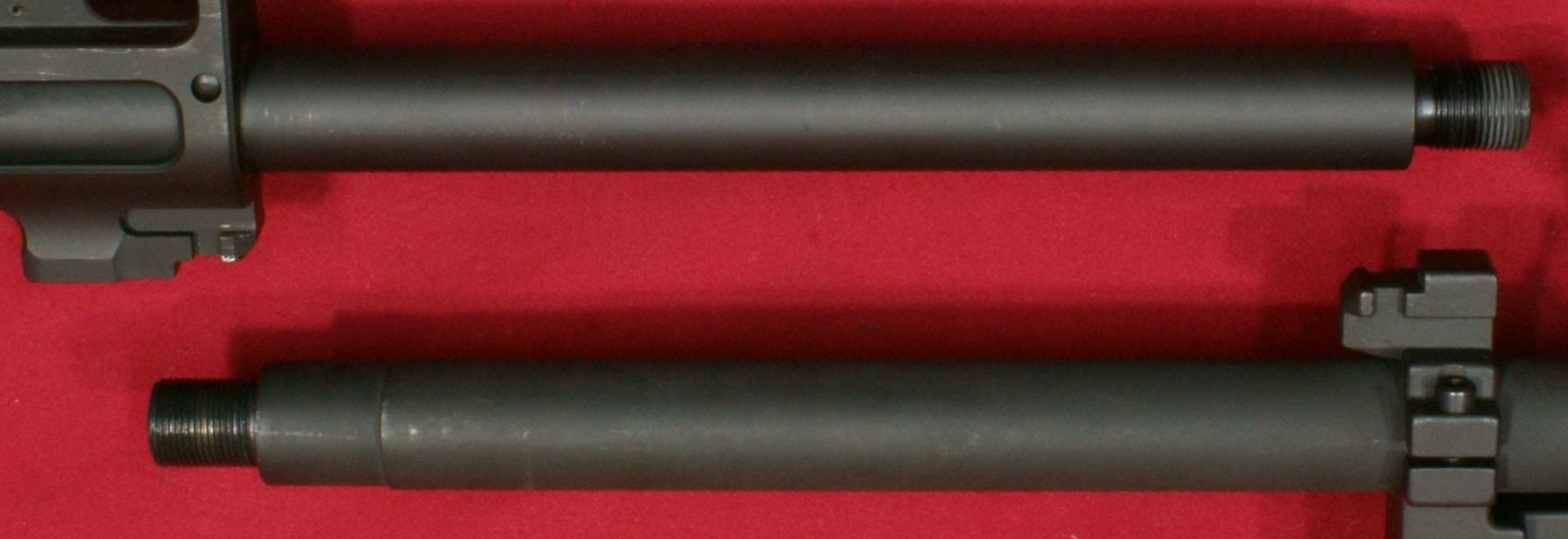 short for this rifle I grabbed one of my other AR rifles, pulled the flash suppressor and started studying differences. The distance between the shoulder of the barrel (not including the threads) and the front of the bayonet lug on my Ruger AR-556 measured about 6.22" while that same distance on another rifle measured 5.88". This 0.34" difference was just enough to prevent this adapter from working on my Ruger rifle. You can see this difference in length between these two rifles below. I have to assume that the combination of Ruger's custom front sight and 16.1" barrel length (not 16.0") might have been the culprit, but honestly I'm not 100% sure.