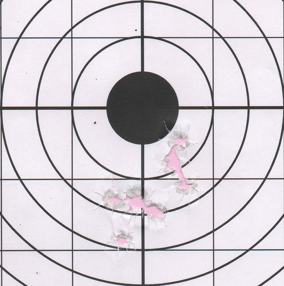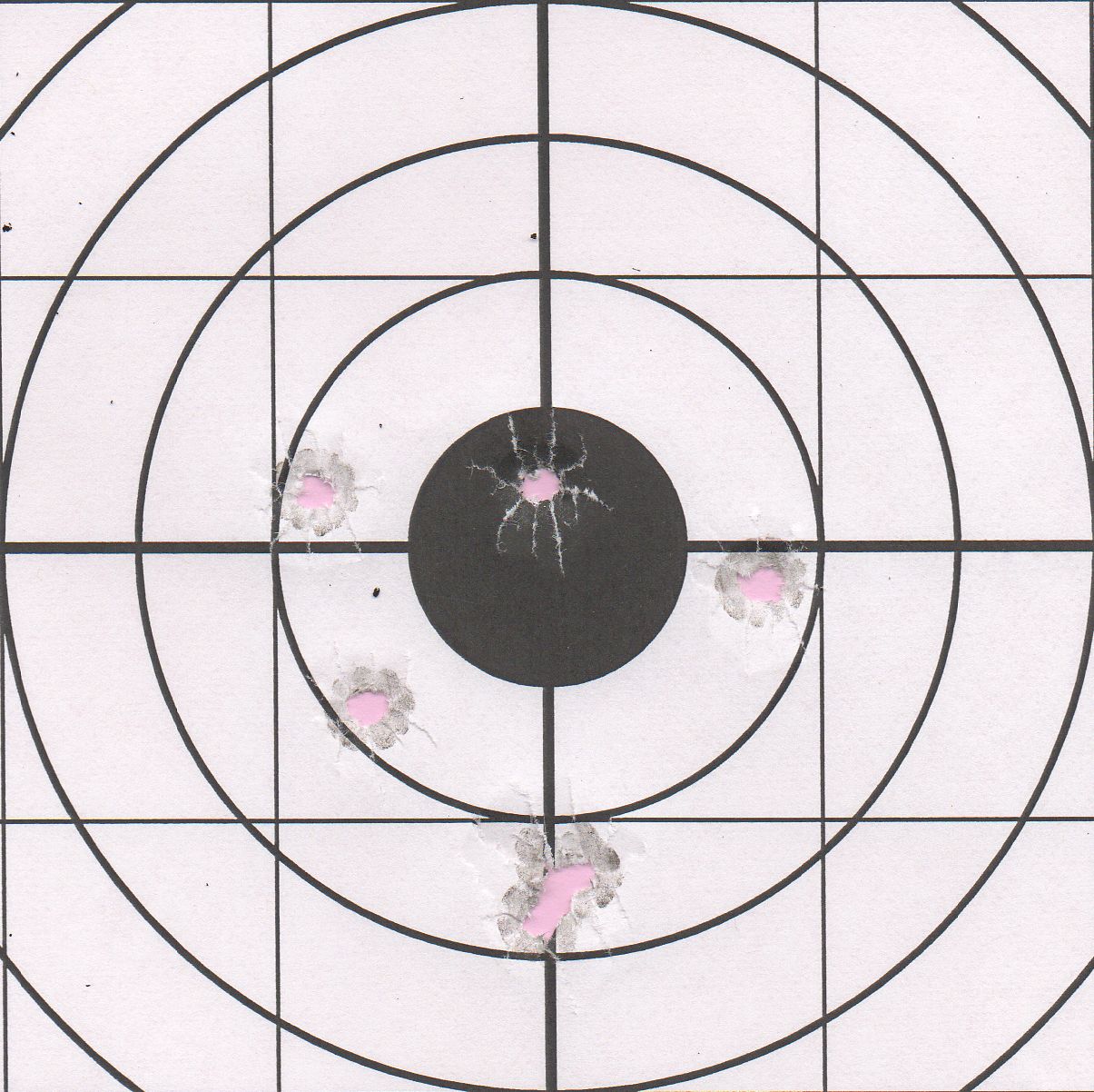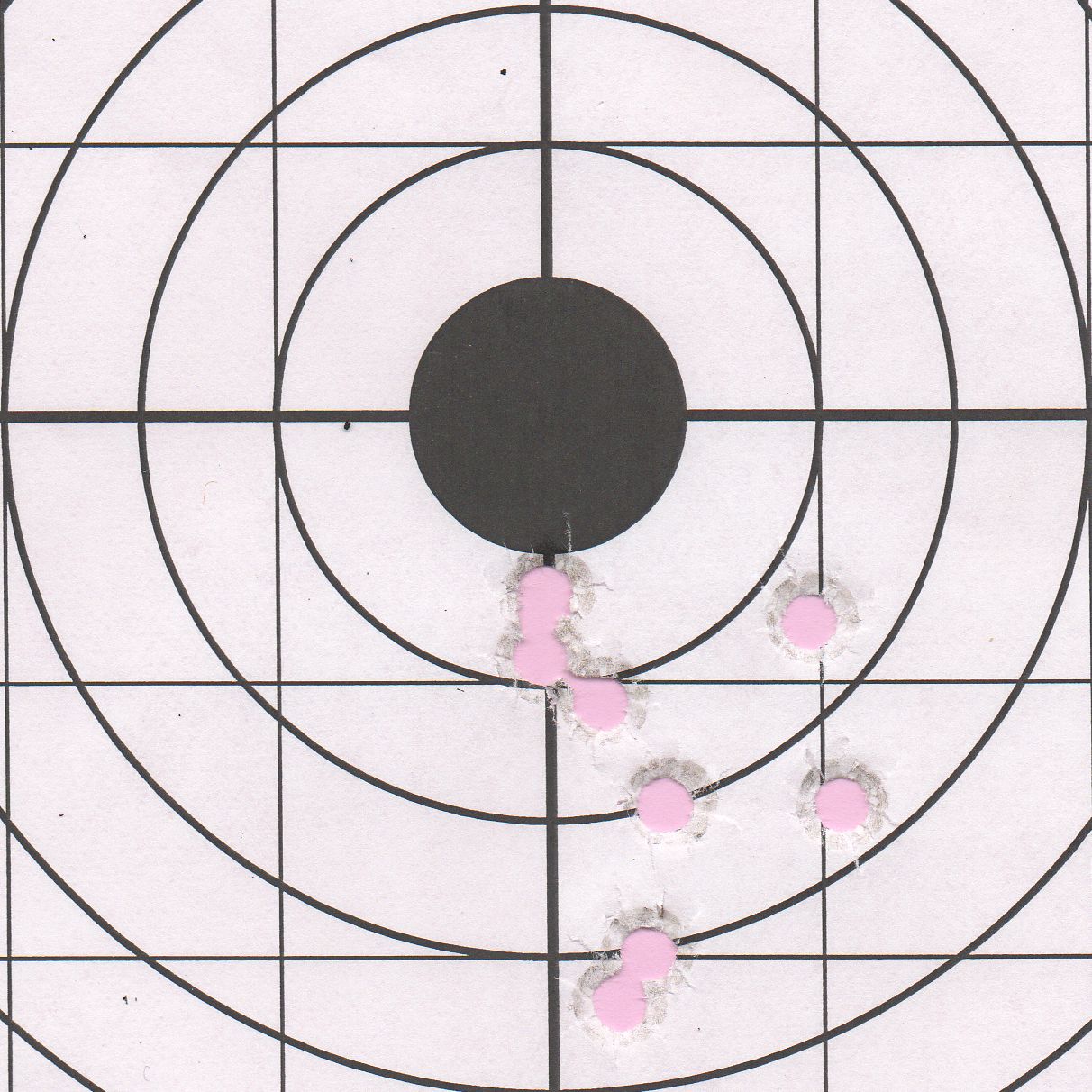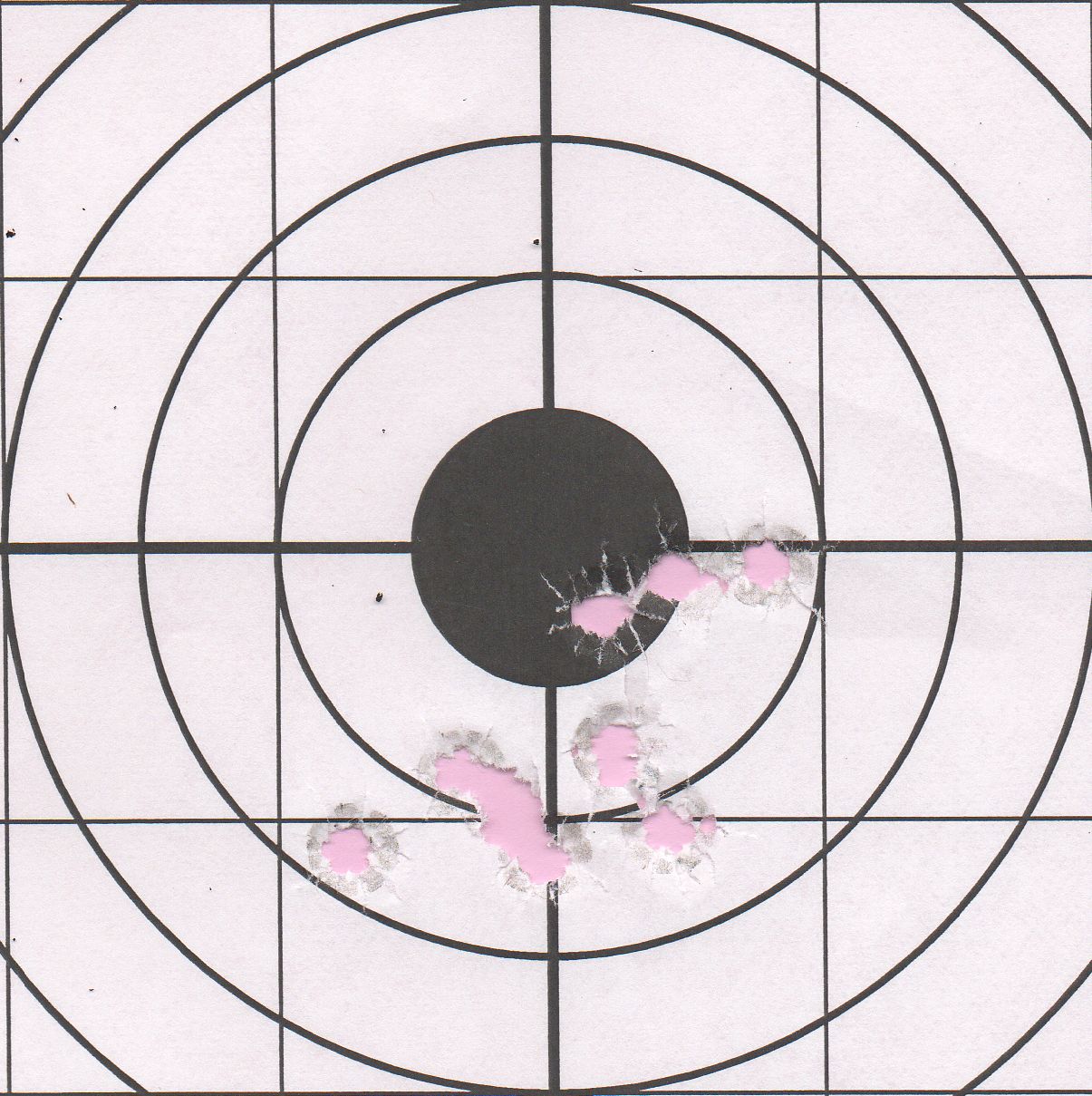 These next photos show some examples of the groups above and give you a visual look at this handguns potential. Keep in mind that the small squares are 1"x1". Later we made one final slight sight adjustment to get the average point of impact shifted up.