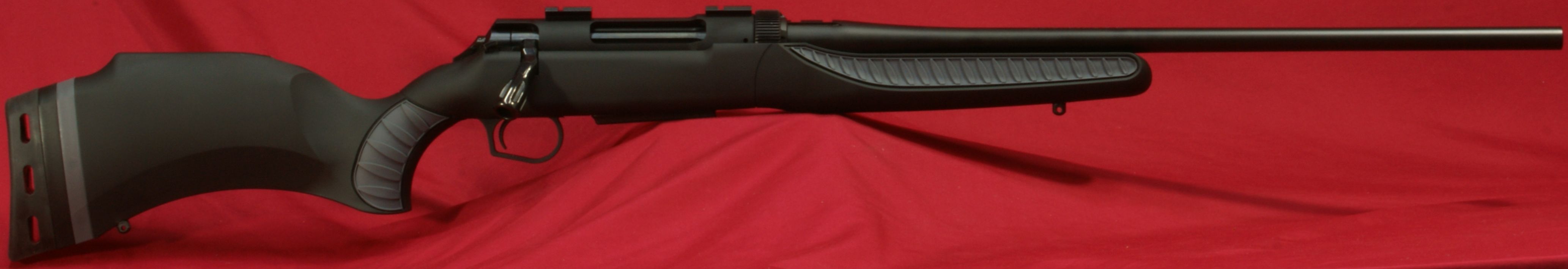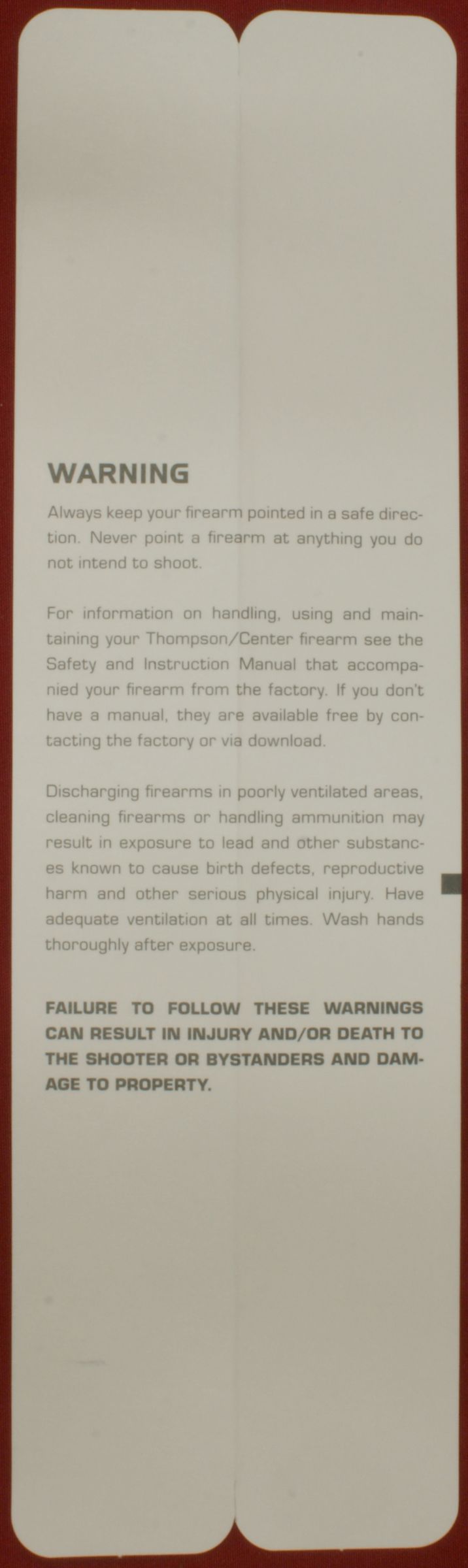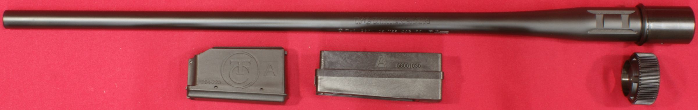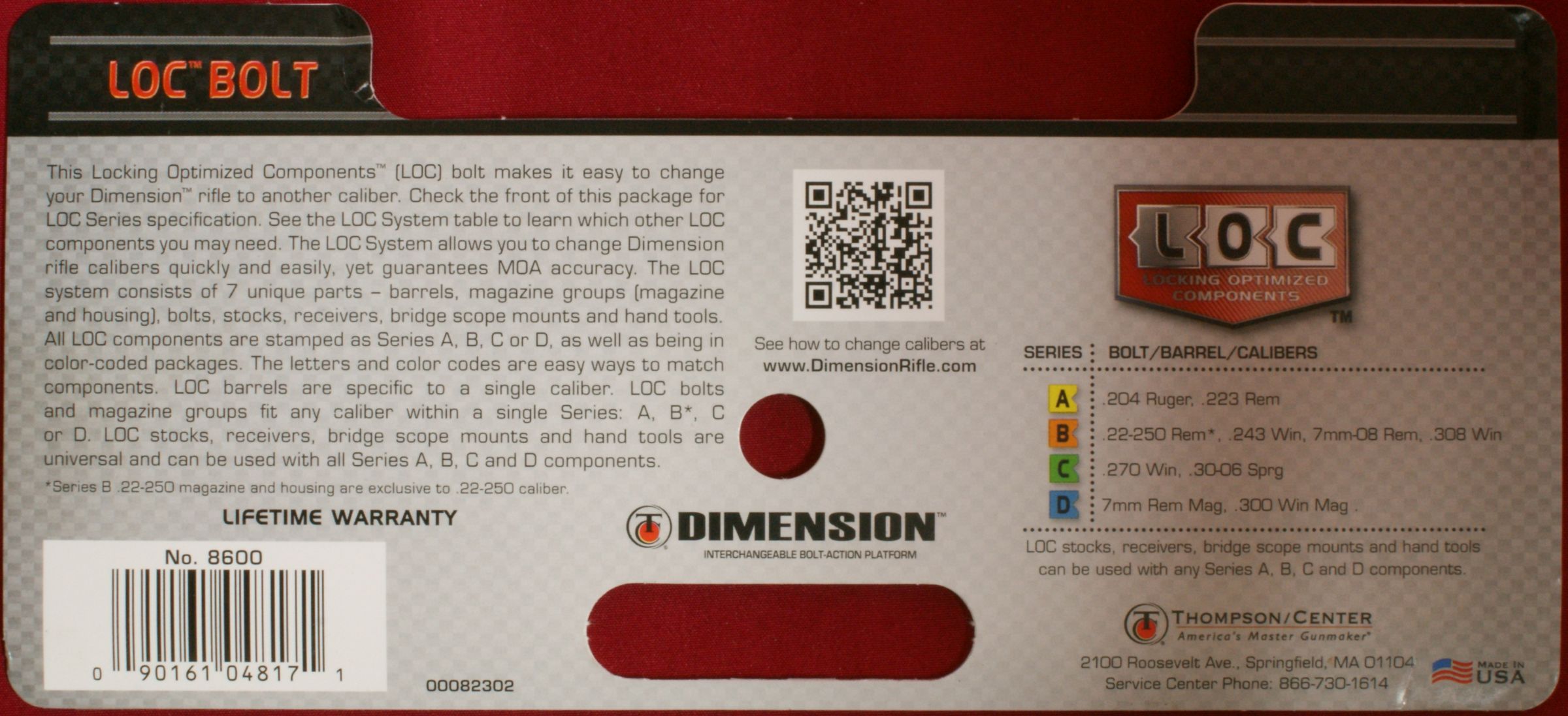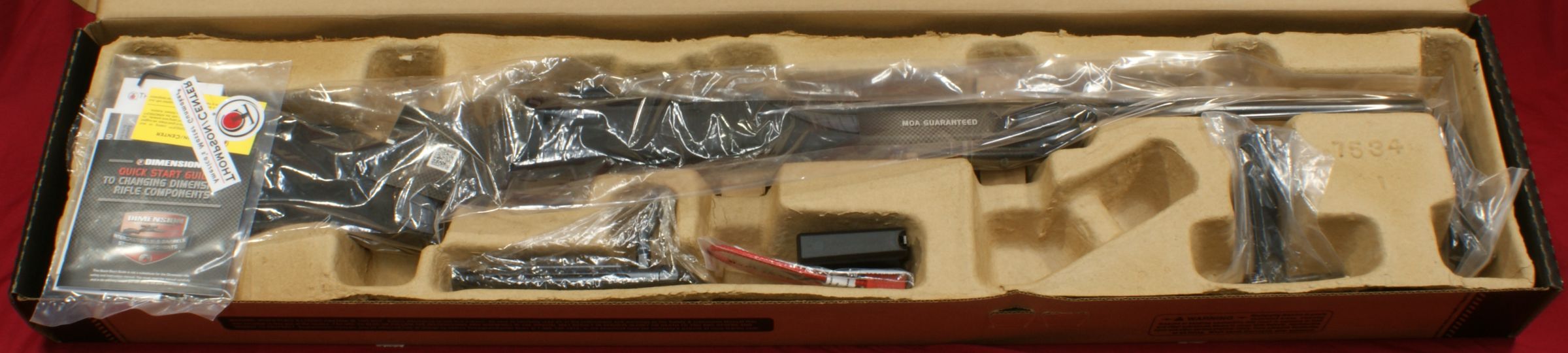 In this next set of photos, I removed the advertising paraphernalia and installed the bolt. These photos help me document the "as received" condition of the Thompson/Center Dimension Rifle and also give you a good overview of the rifle. Additional Barrel, Magazine & Magazine Adapter When you purchase another caliber, the barrel, magazine and magazine adapter all come packaged as shown below. For this review, I chose to get my second caliber in Series A and in .223 Remington. I removed the molded package so you can better see the components. If you want to read the text on the cardboard backing, you will need to click on the photos to bring up a high resolution photo. The photo below shows the back of the cardboard backer. The actual components in the package were the: