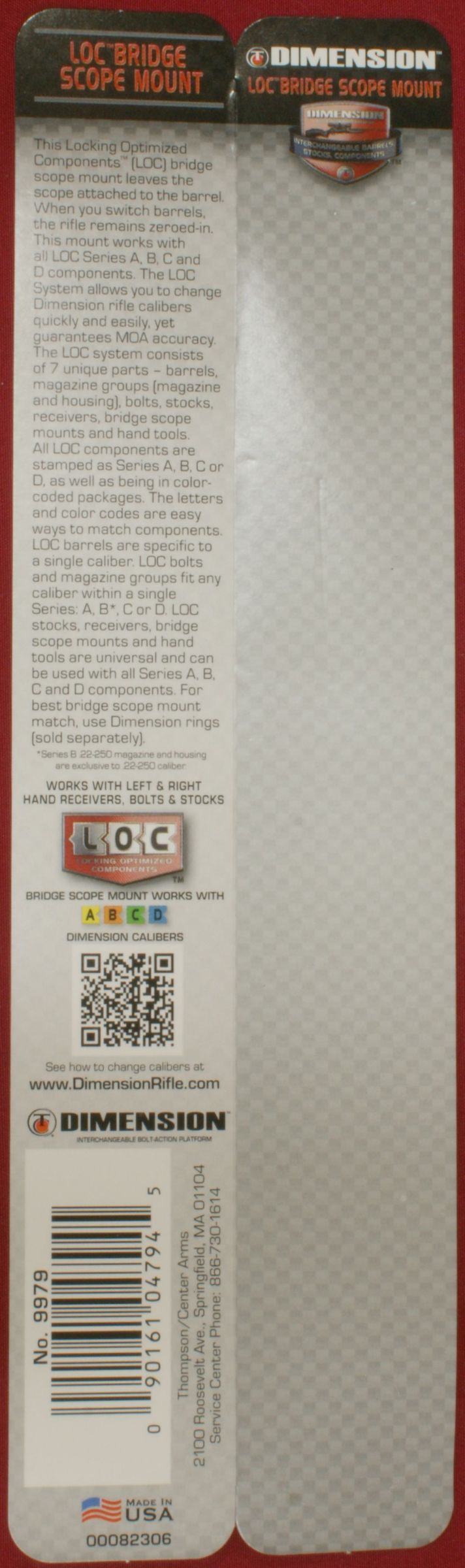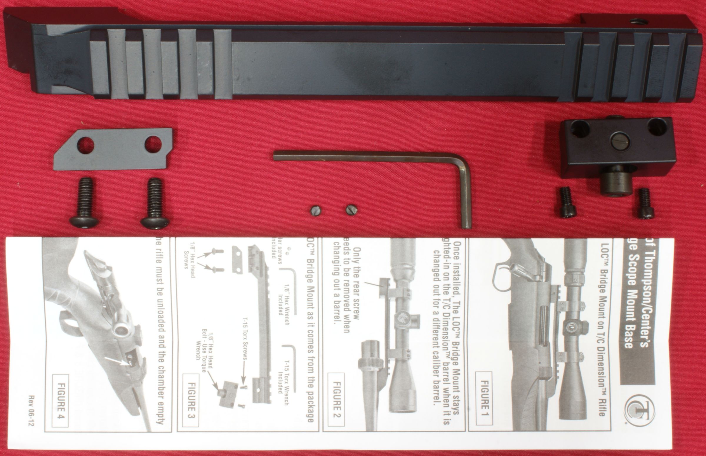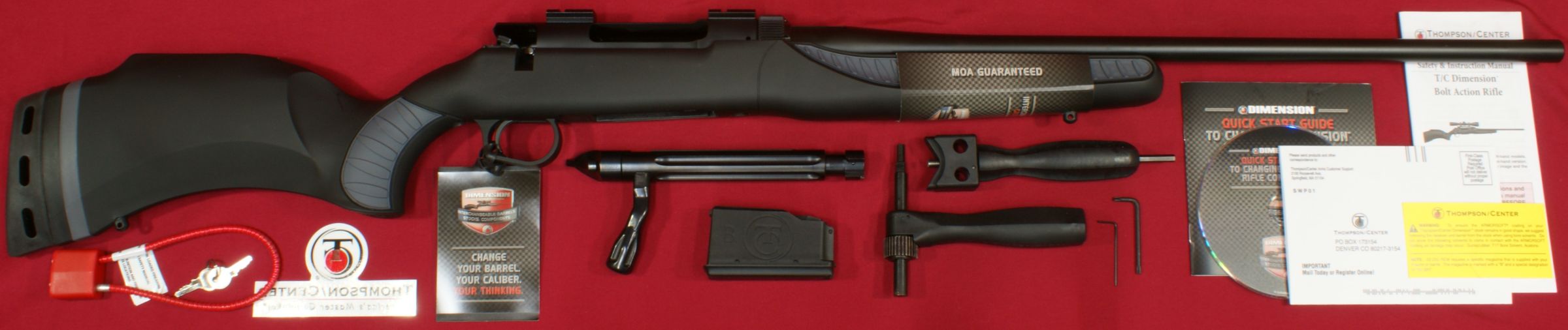 Thompson/Center Arms Dimension Rifle Review In this part of the Thompson/Center Dimension Rifle review, I show all the items that come with a complete rifle. I also show the items you get when you purchase another barrel and bolt which allows you to shoot another caliber in another series. I also show the bridge mount that allows the option to install a scope which can stay with your barrel if you choose to shoot that configuration when swapping barrels.