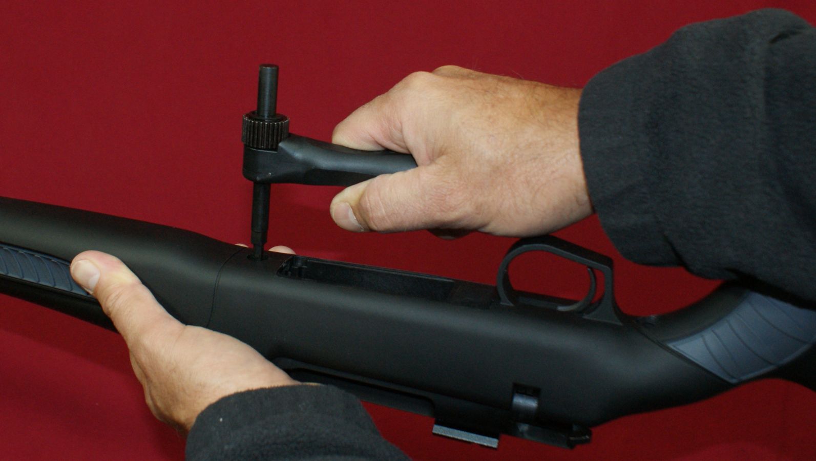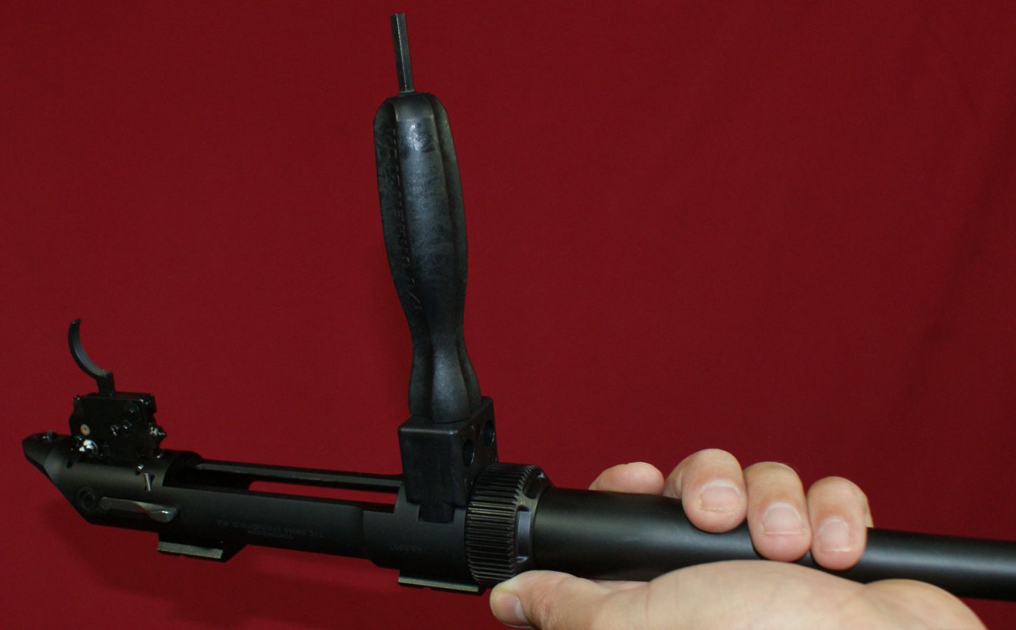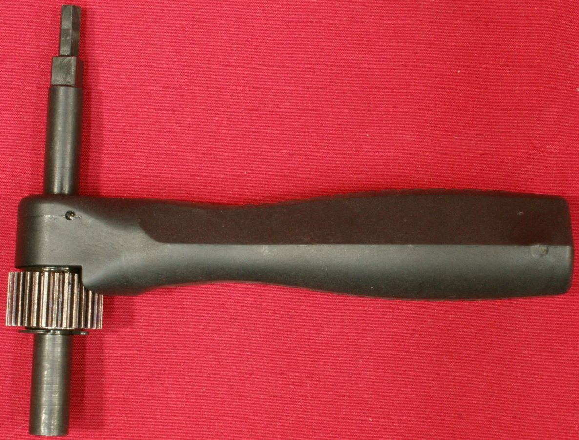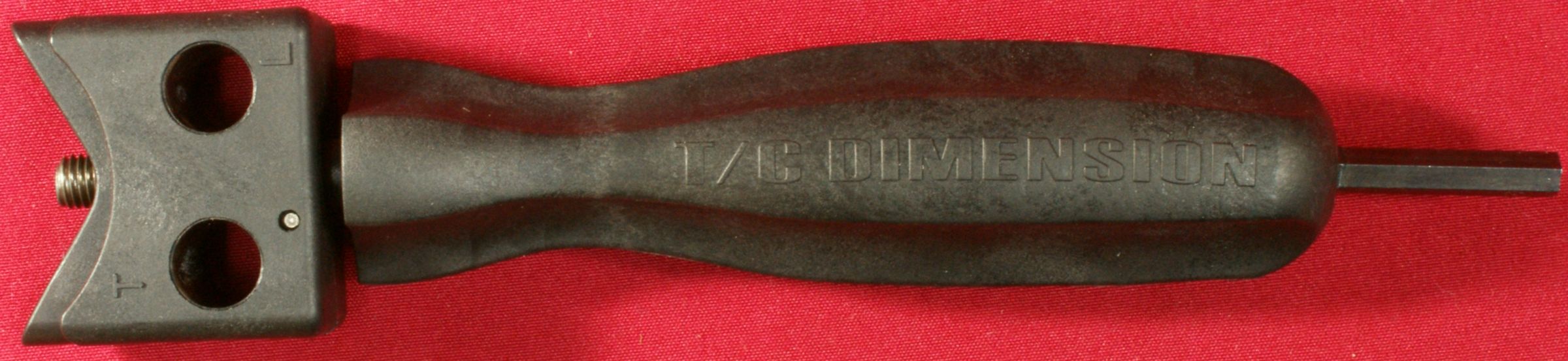 Disassembly (Field Stripping) These steps below are a general guide for disassembling your Dimension Rifle, yet you should always consider the manufacturer's Safety & Instruction Manual as the official source of information when handling and disassembling your rifle. T/C has done a good job with their descriptions and photos in the manual, along with providing many safety related comments and warnings. Step 1 - Unloading & Safety The first step when preparing to disassemble or clean any firearm is verifying that the firearm is unloaded and the safety is in the "safe" position. I start out by first checking the safety and removing the magazine. Then I lift the bolt handle and pull the bolt fully to the rear and inspect the chamber to verify that the rifle is unloaded. Step 2 - Remove the Bolt Actually, bolt removal is the trickiest part of disassembly. Due to the high cheek rest (comb) on the buttstock, the bolt cannot be pulled to the rear in its normal up position. To remove the bolt, you must press the bolt stop and rotate the bolt handle down as shown. With the handle down (nearly touching the buttstock), you can continue to pull the bolt out of the receiver. Although it sounds simple, and it is, you will find that there is a "sweet spot" when pressing the bolt stop, rotating the handle down, and pulling the bolt rearward which can be done in a single fluid motion. It took me a couple of times before I found the right combination of motions to make it look smooth and like I knew what I was doing. Like most bolt action rifles, removal of the bolt is all that is needed for normal field stripping for cleaning. Changing Calibers Tools The T/C Dimension Rifle comes with two tools to be used when changing calibers; the Torque Tool and V-Block Wrench. The key features of the Torque Tool are listed below. I measured the torque produced by the wrench and found it to be barely over 55 in-lbs.