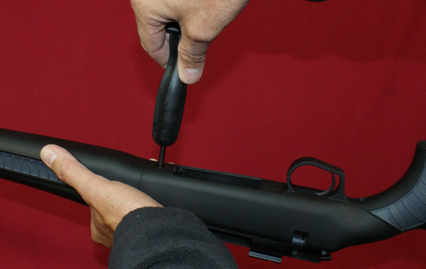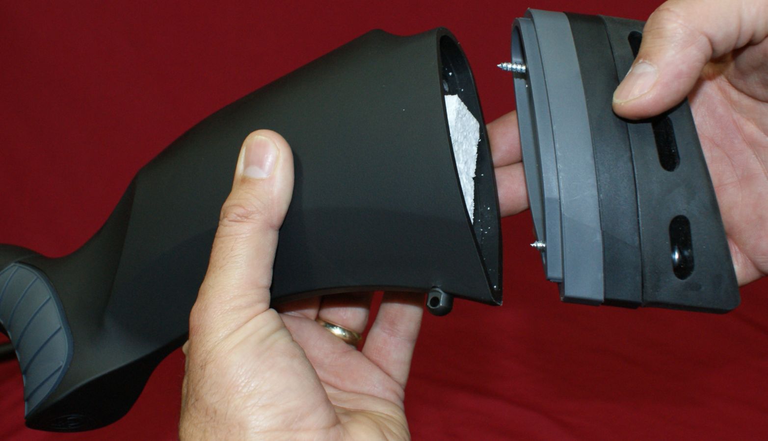 Figure 21 Reassembly Reassembly is basically these steps in reverse. The two things to note are that the bottom of the receiver has a notch for an alignment pin that is on the bottom of the barrel, and you will use the "T" tighten hole with the Torque Tool during assembly. Changing Length of Pull The Dimension rifle comes with two 1/2" spacers that can be removed to adjust the length of pull to either 1/2" or 1" shorter. To remove these spacers, insert a Phillips head screwdriver in the holes in the buttpad and loosen the two buttpad screws. The buttpad will lift off the end of the stock. Inside the buttstock were some foam pieces which are probably there to help dampen noises produced when something hits the buttstock. Even though the spacers look similar in shape, there is some contour differences that can be seen in the photo above. If you were to shorten your length of pull by 1/2", I believe T/C intended for you to remove the black spacer.