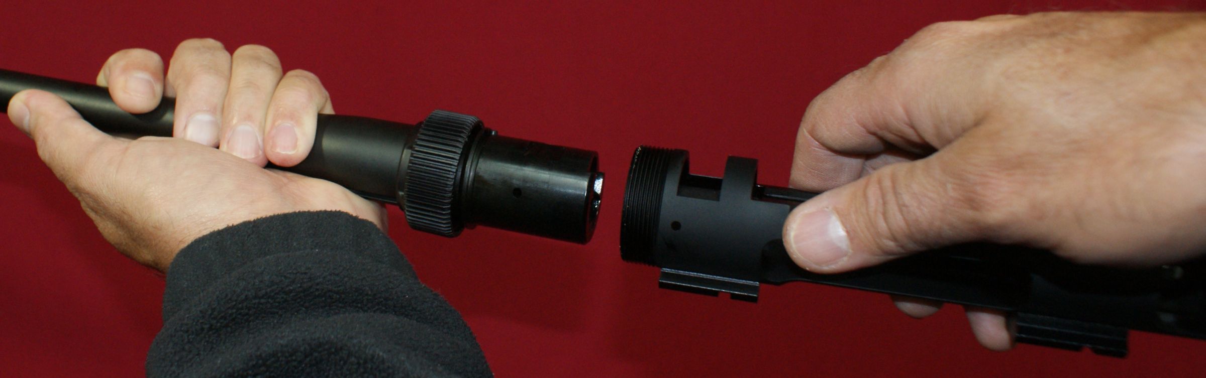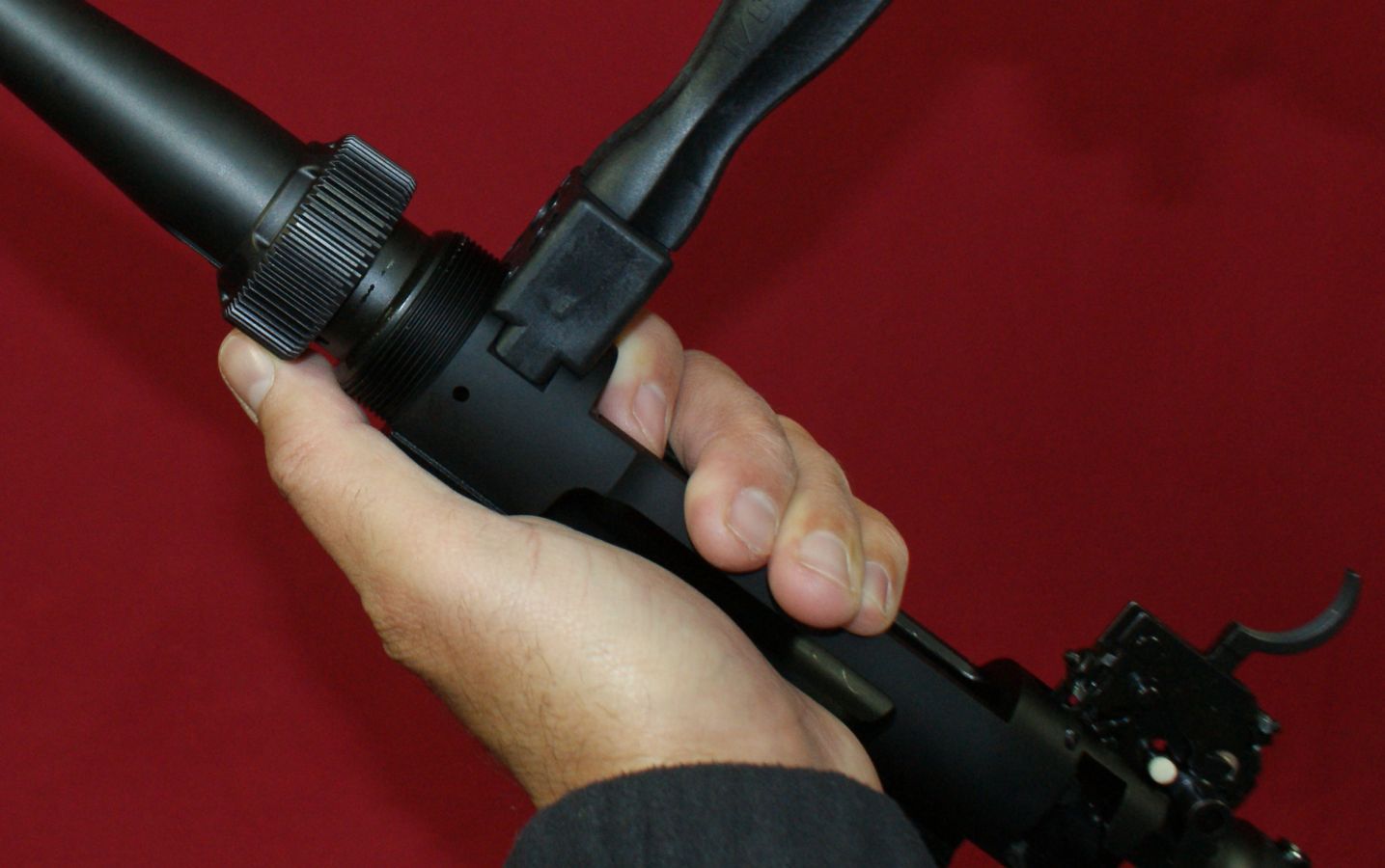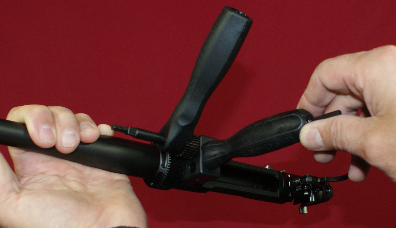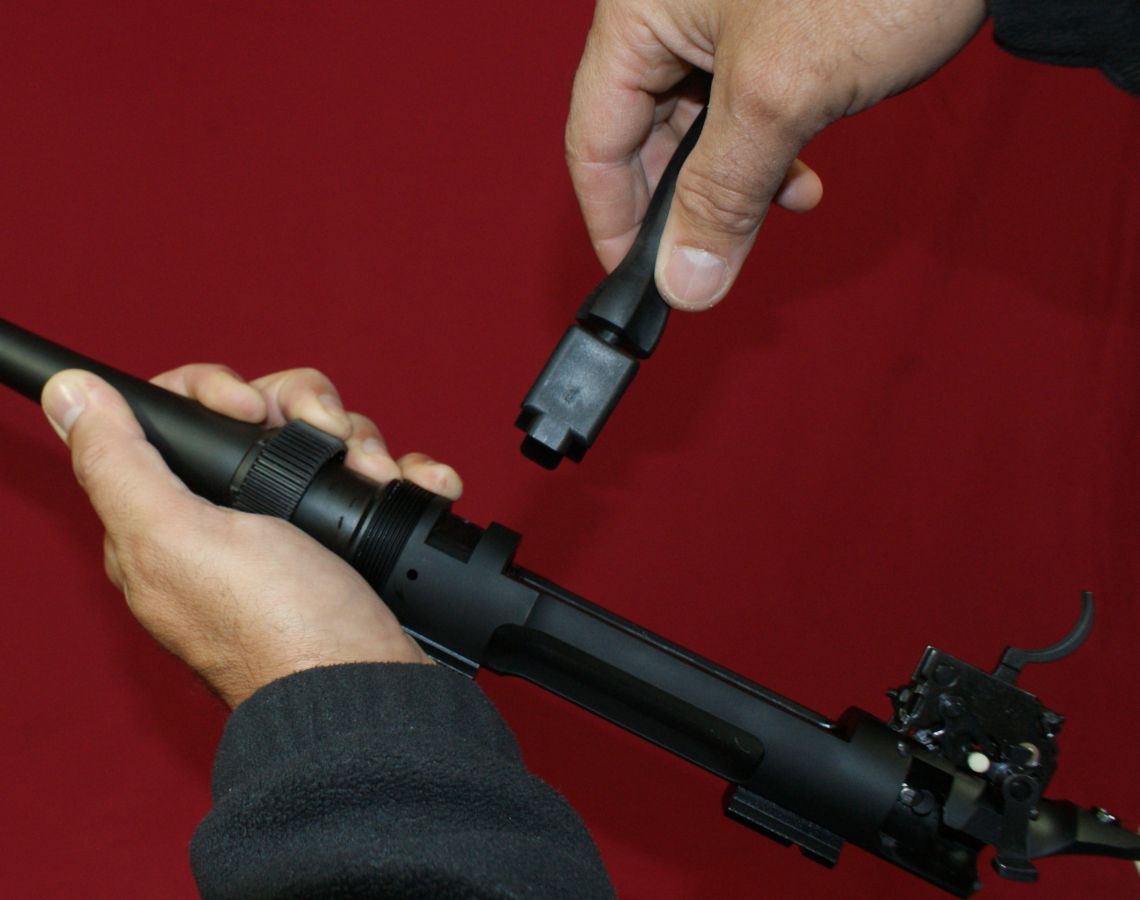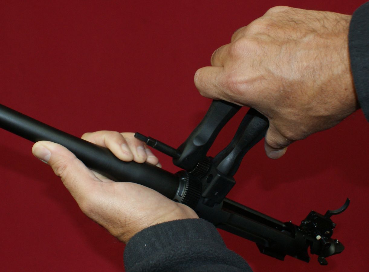 Step 1 & 2 - Safety and Remove Bolt & Magazine The first steps are to perform the field stripping described above which is basically making sure the rifle is unloaded with the bolt and magazine removed. Step 3 - Remove Stock Loosen the stock bolts located at locations A and B (shown below) by using the Allen wrench side of the Torque Tool. Once the screws are loose, you can use the V-Block Wrench to loosen the screws the rest of the way. The screws are not intended to be fully removed from the stock. They have retaining features that keep them as part of the stock assembly to prevent you from losing them in the field. With the two stock screws fully loose from the receiver, you can then lift the receiver and barrel assembly from the stock. Sometimes when the receiver was removed from the stock, I noticed that the bolt stop lever pin and trigger assembly pins shifted out of their holes slightly depending on how I held the receiver. The stock is the portion of the rifle that holds these pins in place. This is definitely something that you need to pay attention to when the receiver is removed from the stock. Step 4 - Remove Magazine Adapter If you are swapping to a different caliber series, remove the magazine adapter and replace it with that of the new series. Step 5 - Remove Barrel On the bottom of the receiver is the location for mounting the V-Block wrench. Nest the "V" portion of the wrench over the forward stock bolt hole in the barrel extension and tighten the handle of the V-Block Wrench until it is snug tight. There is not a top or bottom to the V-Block Wrench so you don't have to worry about the orientation. The V-Block Wrench has two holes that are marked "L" for Loosen and "T" for tighten. Insert the Torque Tool pivot in the correct hole depending on wether you are removing or installing a barrel. The photo below shows the tool in the "L" hole where the handle of the Torque Tool is above the handle of the V-Block Wrench. Make sure the teeth on the gears are fully engaged prior to applying pressure on the tool By squeezing on the two handles (like a pair of pliers), the barrel nut will loosen. Once you have removed the torque from the barrel nut, you can continue to loosen the nut by hand (no tool needed). Once you have un-torqued the barrel nut, you can remove the V-Block Wrench. In this case, I removed the wrench after fully loosening the barrel nut, but could have removed the wrench before I completely loosened the barrel nut. With the barrel nut completely loose and the V-Block Wrench removed, you can slide the barrel out of the receiver. The photo below shows the rifle fully disassembled and ready to configure into a new caliber.