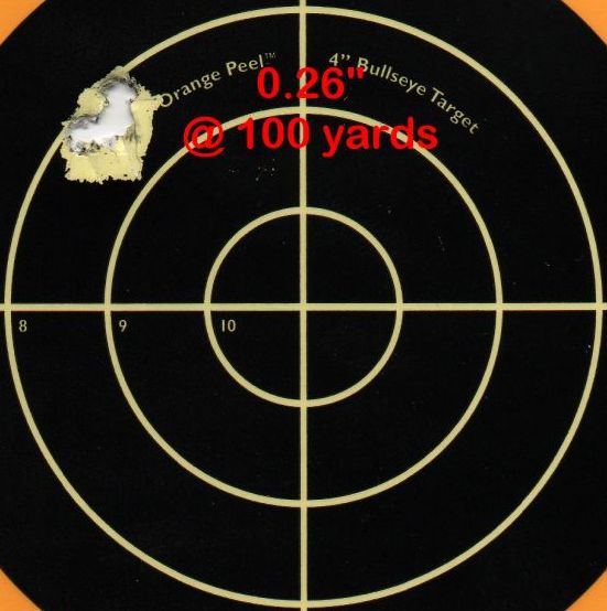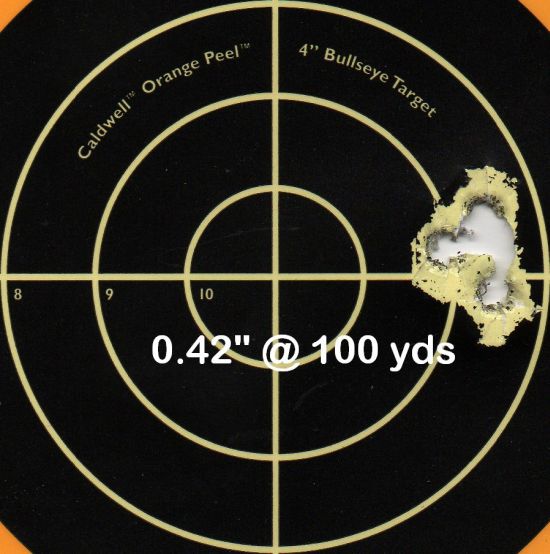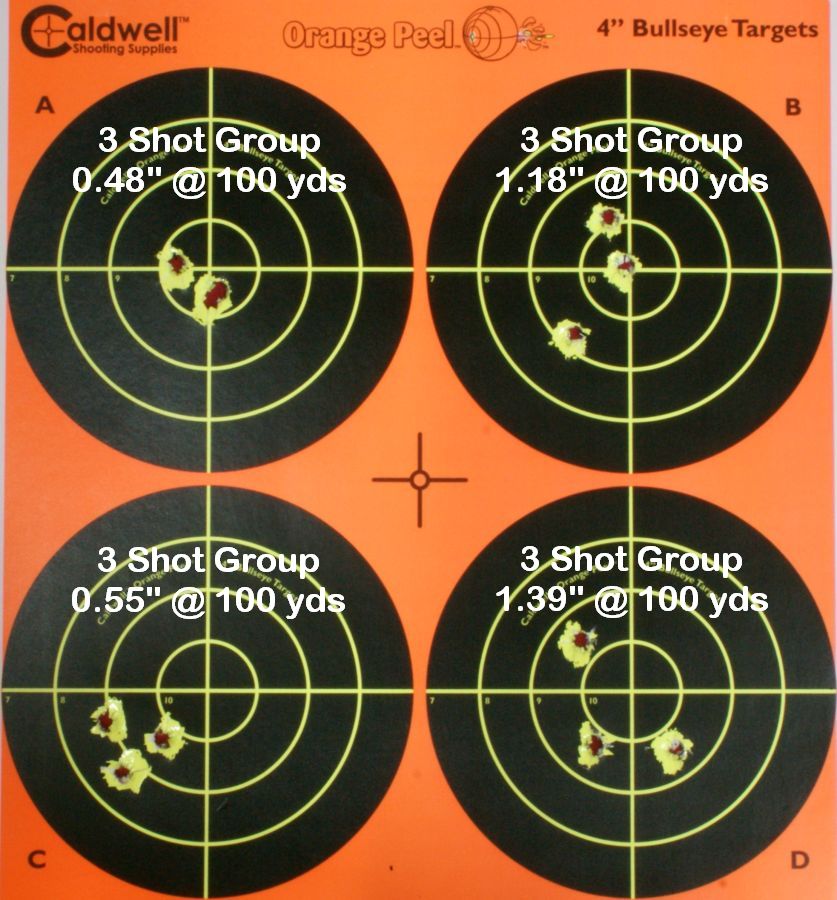 I initially bore sighted the rifle at 25 yards then fired some shots to dial in a basic zero prior to shooting at 100 yards. At 100 yards, I shot a couple of groups working to finalize a zero. Next I wanted to evaluate the rifle's ability to return to zero when removing and installing the barrel while using a receiver mounted scope. During my zeroing efforts, I shot my best 3-shot group in the .308 Win caliber which measured 0.42" . The two targets below makes me believe that the Thompson/Center Dimension Rifle I received is 1 MOA capable as advertised in both .308 Win and .223 Rem calibers. Clearly I'm showing my best groups, but after collecting data from multiple 3-shot groups, my group averages for both the Hornady .223 55gr HP Steel Match and Federal Premium Gold Medal Match 168gr SMK BTHP were just under 1" (0.98" and 0.97" respectively, see table below for summary). I also feel that someone with greater shooting ability could possibly achieve better group averages.