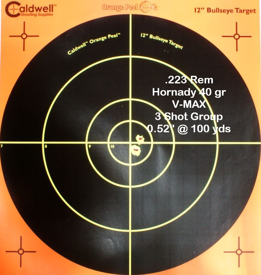 With the scope mounted on the receiver, I swapped to the .223 Rem configuration and went through another round of re-zeroing the rifle. Before I re-zeroed for the .223 Rem, I first set my adjustable turret caps on my scope so that the "0" locations would mark my .308 Win zero. The .223 Rem configuration rifle zeroed in with 1.5 MOA down adjustment and 7 MOA left adjustment. With this configuration, I shot the Hornady 55gr V-Max and G-Max cartridges. The G-Max gave slightly better results as shown in the table above. When I compare my range results to those in a review by Guns and Ammo Magazine, I actually feel pretty good about my shooting abilities. Overall my average group sizes were less than what they indicated in their article. One thing that seems clear is that the slow twist rate (1:12") on the 0.223 caliber barrel could possibly produce tighter groups with a lighter bullet. In the G&A review, the author was able to get a group average of 0.76" using some Hornady 40gr V-Max ammunition. Another thing I noticed was that when you remove the barrel assembly from the stock, the two pins holding the trigger assembly in place and the pin holding the bolt stop lever in place would start to slide out of their holes. Once I noticed this, I was careful to make sure they didn't drop out during a barrel change. Clearly this is something you will want to watch when changing barrels in the field. My next trip to the range allowed me the opportunity to study the .223 Rem caliber configuration further and the time to get some Hornady 40 gr V-Max ammunition for evaluation. The next couple of photos show my range test configuration and bench setup. During this second range test, the first step was to convert the rifle back to the .223 Rem configuration since my last shots during my previous range tests were with the .308 Win configuration. It had been about 6 weeks between my first and second range tests and also it was about 30 degrees cooler for the second test, so I was a little conservative when I set up the 12" target shown below for my first shots of the day. I dialed in my target turret offsets for the .223 Rem from my previous range test and then shot this 0.52" three shot group shown below. Honestly, I was impressed. I then swapped out the target and removed/reinstalled the barrel between each of the four groups shown below and I feel the results speak for themselves. All 12 of these shots fall within a common rectangle about 1.32" wide and 1.28" tall. Lastly, I changed back to the .308 Win configuration and dialed my turrets back to no offset and shot the group below. This 0.61" three shot group fell about 1.25" to the right when compared to my groups (see Figure 4) with this ammunition. At this point I started to consider this variability to potentially be a system variability which would also include the scope. Figure 9