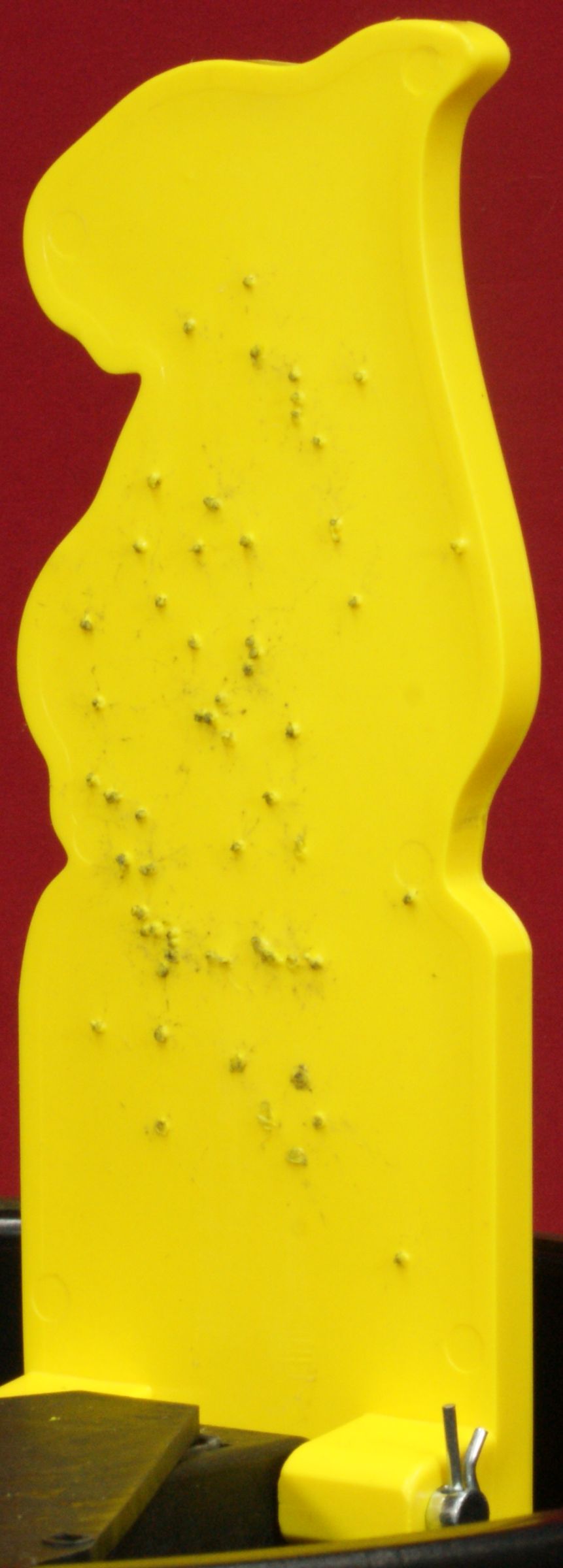 Lastly, I have to talk about the price. At an MSRP of $249 (was originally $334), I'm sure a few of you may still feel sticker shock. Fortunately, Varmint Target provides free shipping and handling which can be between a $20 and $30 dollar savings depending on your location. There is no doubt that this target has a high complexity factor when you consider it combines custom molded parts, weldment, armor plate, rechargeable battery, electronics, sensors and a self healing target, all of which add to the cost. After getting more information on the Varmint Target, I found out that this Target is a true "Made in the USA" product. The owners know that they could send the plans overseas and get them built cheaper, but doing that defeats what the makers of the Varmint Target are trying to do. It is more important for them to keep jobs in the USA, potentially limiting their customer base, than maximize profits. For me, I don't mind paying a little more for an American made product because in the end I feel that I'm investing in America which is a good thing. Since the Varmint Target was introduced at the beginning of 2012, they have had good success and are getting interest from the NRA and the Boy Scouts of America. Hopefully in time production rates will increase which may bring costs down and make them affordable to a greater number of shooters. The photo below shows my 14 year old niece having fun shooting the target for the first time. The urethane prairie dog does a good job as handling the rimfire ammunition. You can also see that the armor plate took a couple of hits. There was a very slight dimple where the round impacted the plate, but I wouldn't consider the dimple as any type of significant damage to the plate. These next few photos show the bullet impacts to the prairie dog (front and back) and the armor plate.