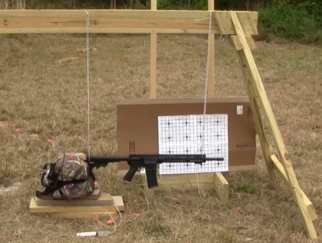 Flash Suppressor I also installed the FOSSA-762™ muzzle device on a home built 300 BLK rifle that has a 16" barrel. Since the FOSSA-762™ is a .30 caliber muzzle device, it could easily be considered as a device for the 300 BLK rifle. My night video showed that this 300 BLK rifle with a 16" barrel does not produce hardly any flash even without a muzzle device. The worst flash of 5 shots is shown below. There was no visible flash when using the FOSSA-762™ or the A2 styled muzzle devices. Figure 20 - 300 BLK, 16" Barrel, No Muzzle Device The last firearm that I wanted to evaluate this flash suppression with this muzzle device was another home built 300 BLK pistol that has an 8" barrel. I'm not sure how many people would choose to install the FOSSA-762 on this platform, but I felt it would be a great way to put the flash reduction feature to the test on a short 300 BLK platform. Please ignore the fact that I haven't selected the type of handguard to use on this pistol yet. Figure 21 This 300 BLK pistol had an impressive fireball when no suppressor was installed. Figure 22 Out of the five shots taken on video using the FOSSA-762™, this photo below was the only image with anything visible. The other four shots were not even noticeable. I feel this shot was visible only because of the powder spark coming out of the barrel. Figure 23 With the A2 flash suppressor installed, each shot produced a red glow at the muzzle similar to that shown in the photo below. Figure 24 For my range tests, I also wanted to try and obtain some objective data for the device's muzzle rise and recoil reducing capabilities. Just like I did in my review of their FOSSA-556™ device, video seemed to do a good job showing flash reduction, but I struggled with an objective way to show the muzzle rise and recoil reducing characteristics without spending significant dollars in instrumentation. After brainstorming and feedback from one of my engineering friends, I decided to support the firearm from bungee cords to "float" the firearm and let the video of the firearms movement after firing be an indication of effectiveness. Although, interpretation of the video is more qualitative, yet I felt it would still give some objective data. The photo below shows my setup. The rifle is supported by two bungee cords, one at the front and one at the rear. The sand bags behind the buttstock are used for evaluating the muzzle rise aspects and with the sand bags remove the rifle could swing similar to a pendulum so I could try and understand recoil reducing aspects. This next video shows all of my range testing using this setup and the conclusions are summarized below. In the video I show the recoil of the rifle in both normal speed and slow motion. I have also tried to place some reference marks in the video so you see the differences in recoil or muzzle rise. After completing the tests and reviewing all the video (although I only show one shot in each configuration, I shot each three times), I feel next time I will use regular string for the recoil reducing portion so I can get a pure pendulum effect.